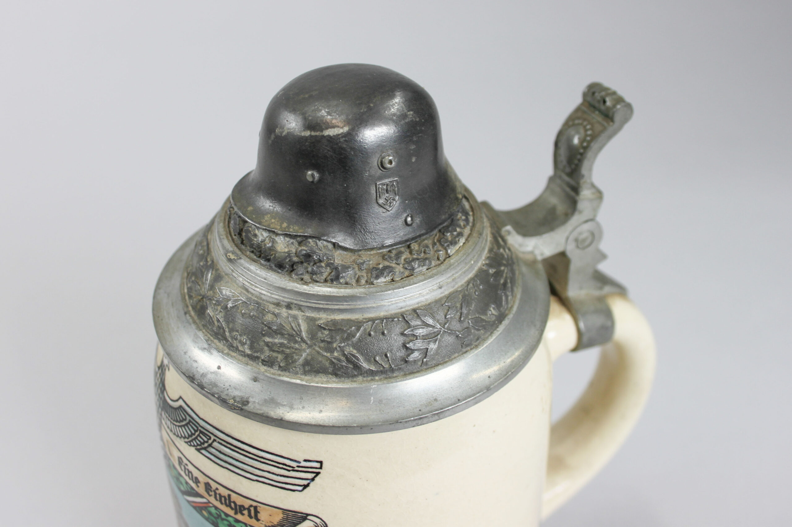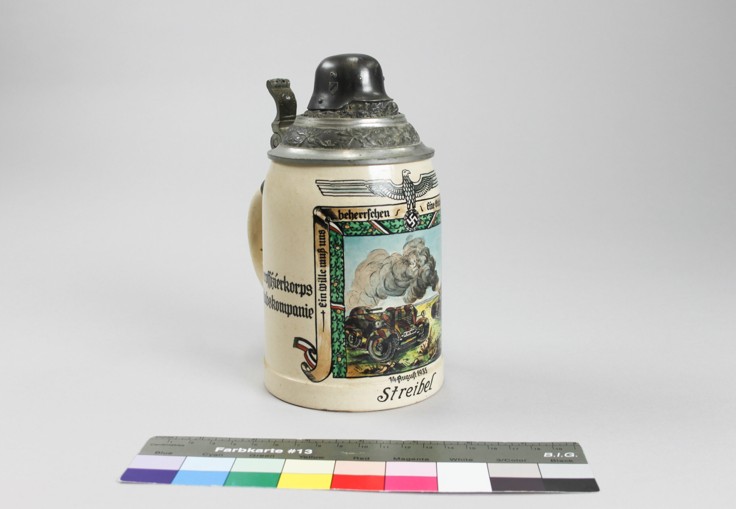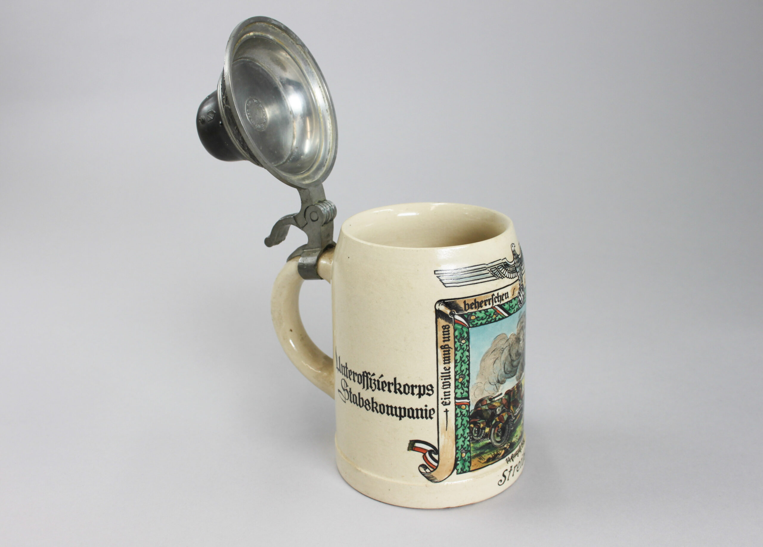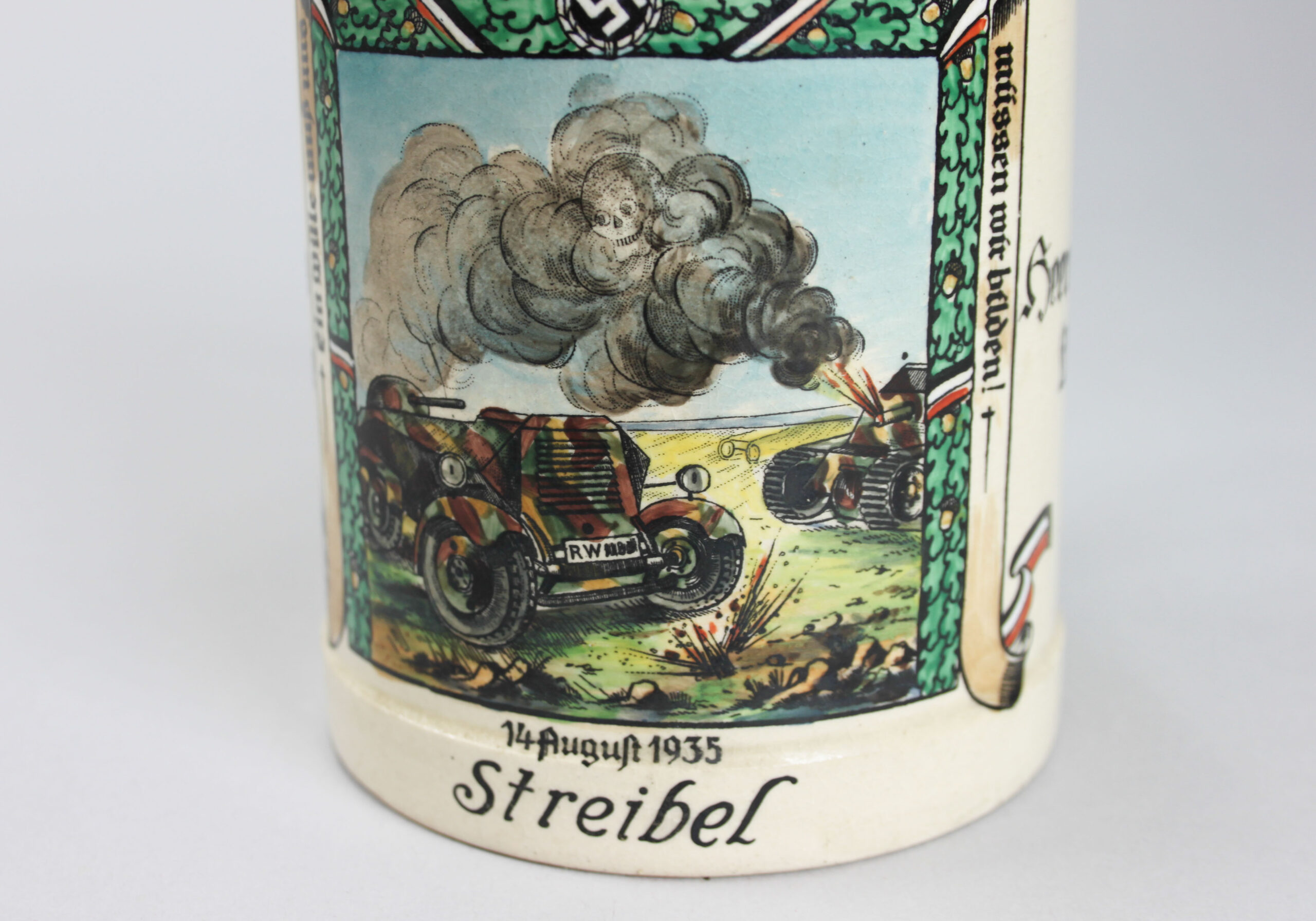 This beer mug was awarded to Richard Streibel on August 14, 1935 at the end of his training as a non-commissioned officer in Wünsdorf. It depicts two armored vehicles: A six-wheeled armored reconnaissance vehicle and a tracked vehicle with a skull and crossbones forming from its gun smoke. The vehicles still bear the RW license plate for the Reichswehr. The picture is framed by a quote from Adolf Hitler: “One will must rule us, we must form one unit.” The lid of the tankard is adorned with an M35 steel helmet with Nazi insignia surrounded by oak leaves, which had only recently been introduced.