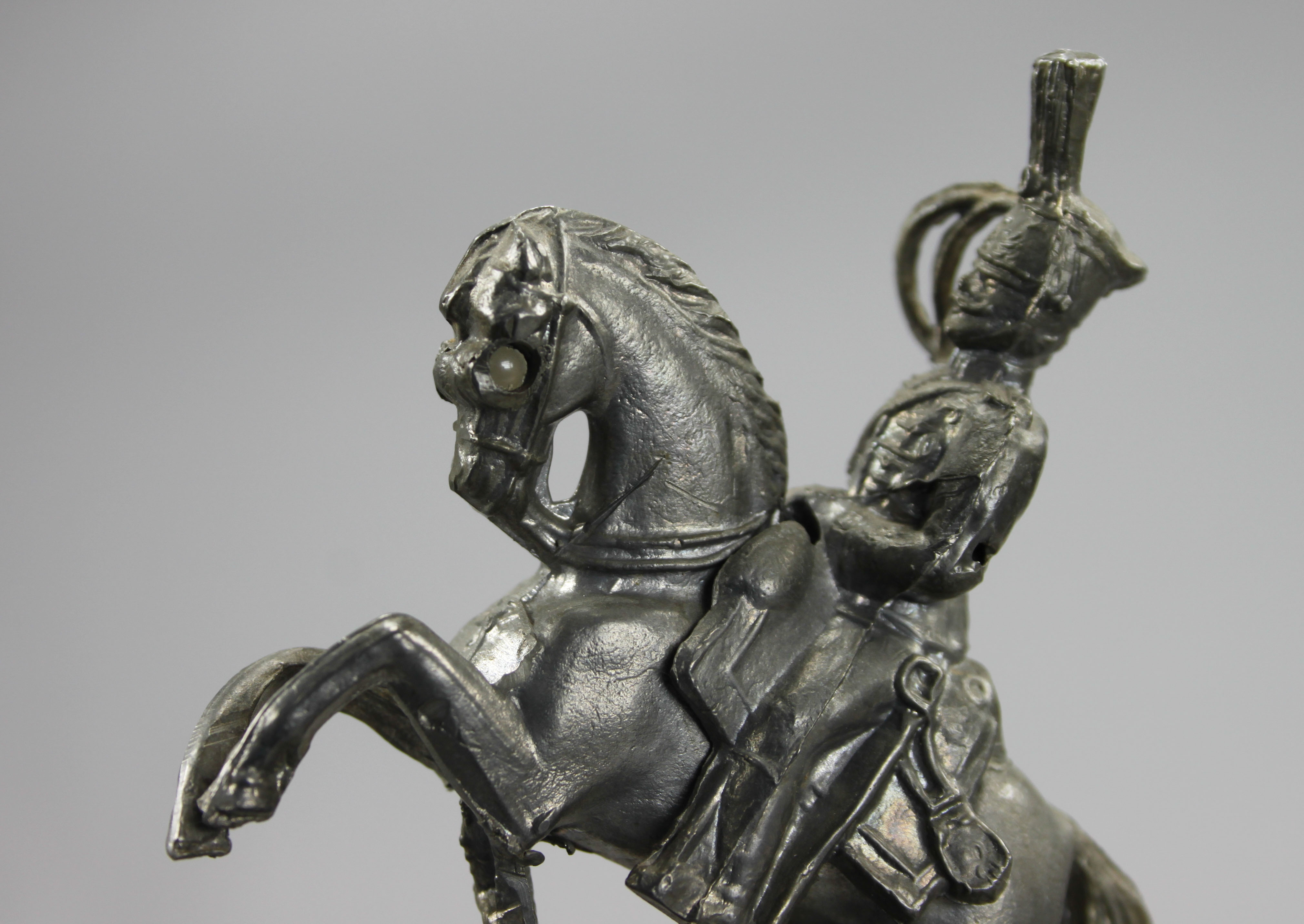 An interesting detail is hidden on the pewter lid of the jug: the lid figure shows a rider with a rearing horse, which has a glass eye. It is a Stanhope magnifying glass with a photomicrograph glued to the flat end, which can be viewed through the magnifying glass. It shows, for example, a portrait of an emperor or other military scenes. The picture is missing from our jug.