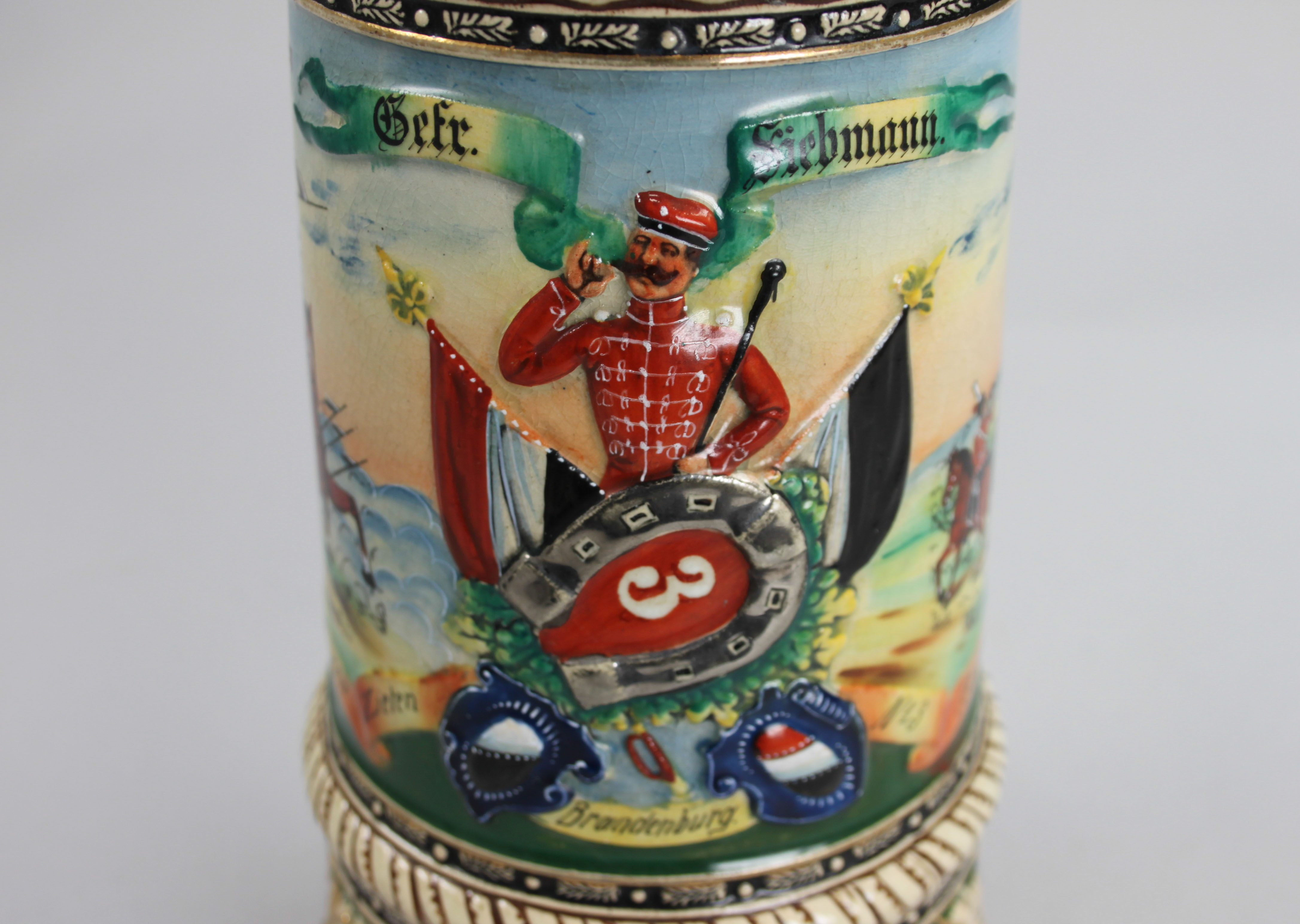 This richly decorated reservist mug belonged to Private Siebmann, who had it made as a souvenir after his three years of military service from 1905-1908 with the 5th squadron of the Hussar Regiment von Zieten (Brandenburg) No. 3 in Rathenow. Cavalrymen served one year longer than other conscripts, as training with the riding horse took more time.
