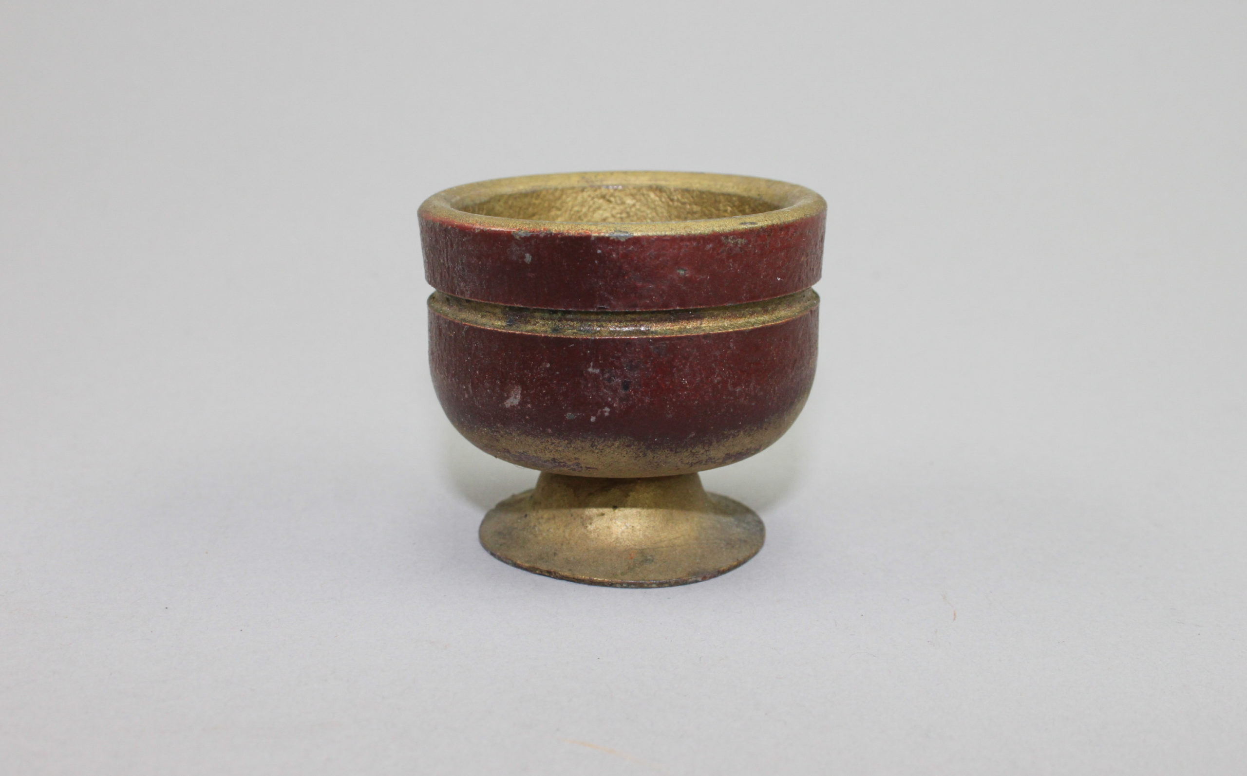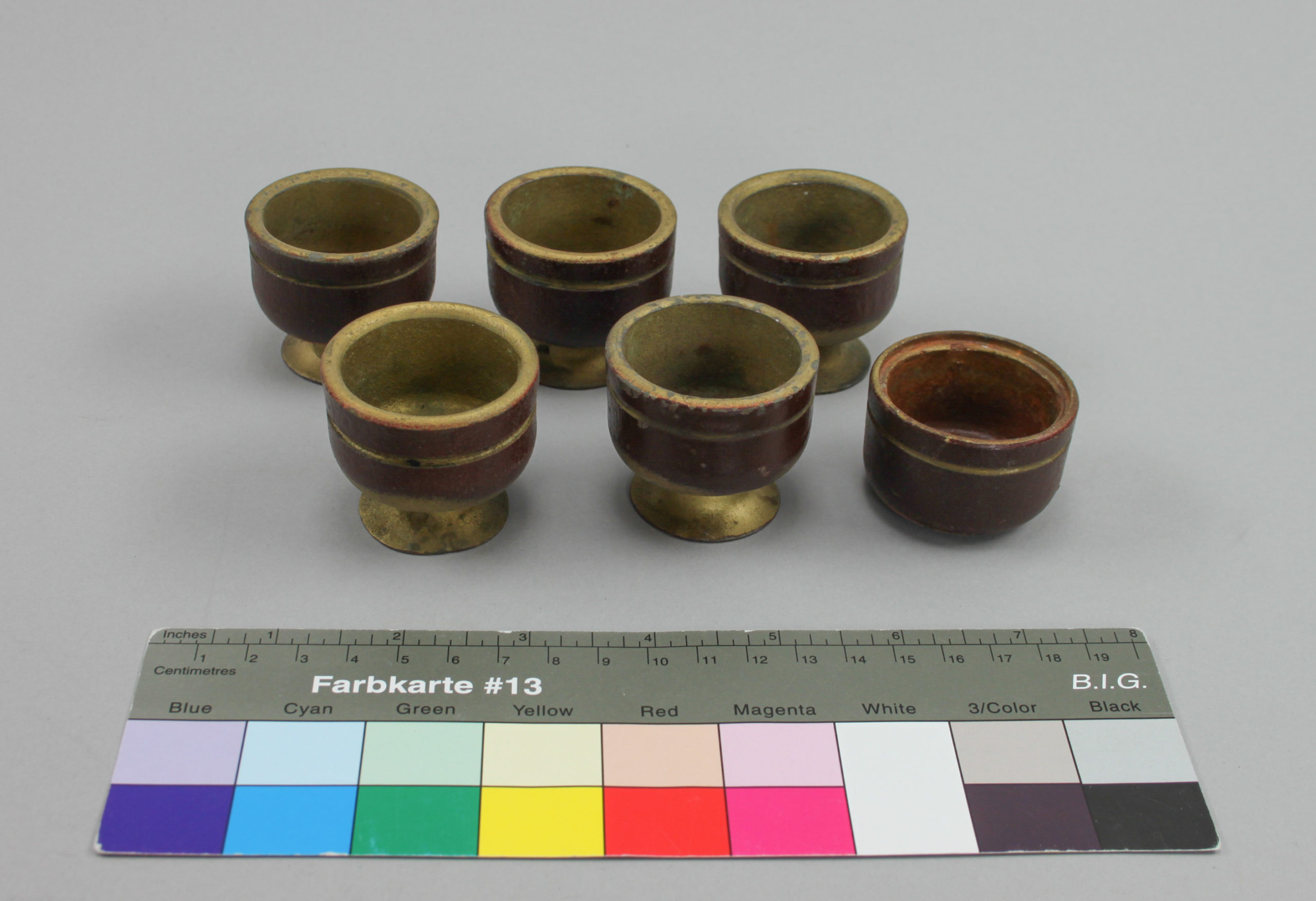 Private individuals also made clothing from parachute silk and uniform coats or processed ammunition parts and other military material into kitchen utensils or toys. Small craft businesses also made use of the available materials. A coppersmith from Bielefeld made these six egg cups from a steel helmet and dyed them red and gold. The helmet came from his daughter-in-law’s brother, who brought it with him after his release from French captivity. Until recently, it was carefully kept by the family and has now been handed over to the museum. Without the history that has been handed down, you wouldn’t be able to tell that they were previously a steel helmet.