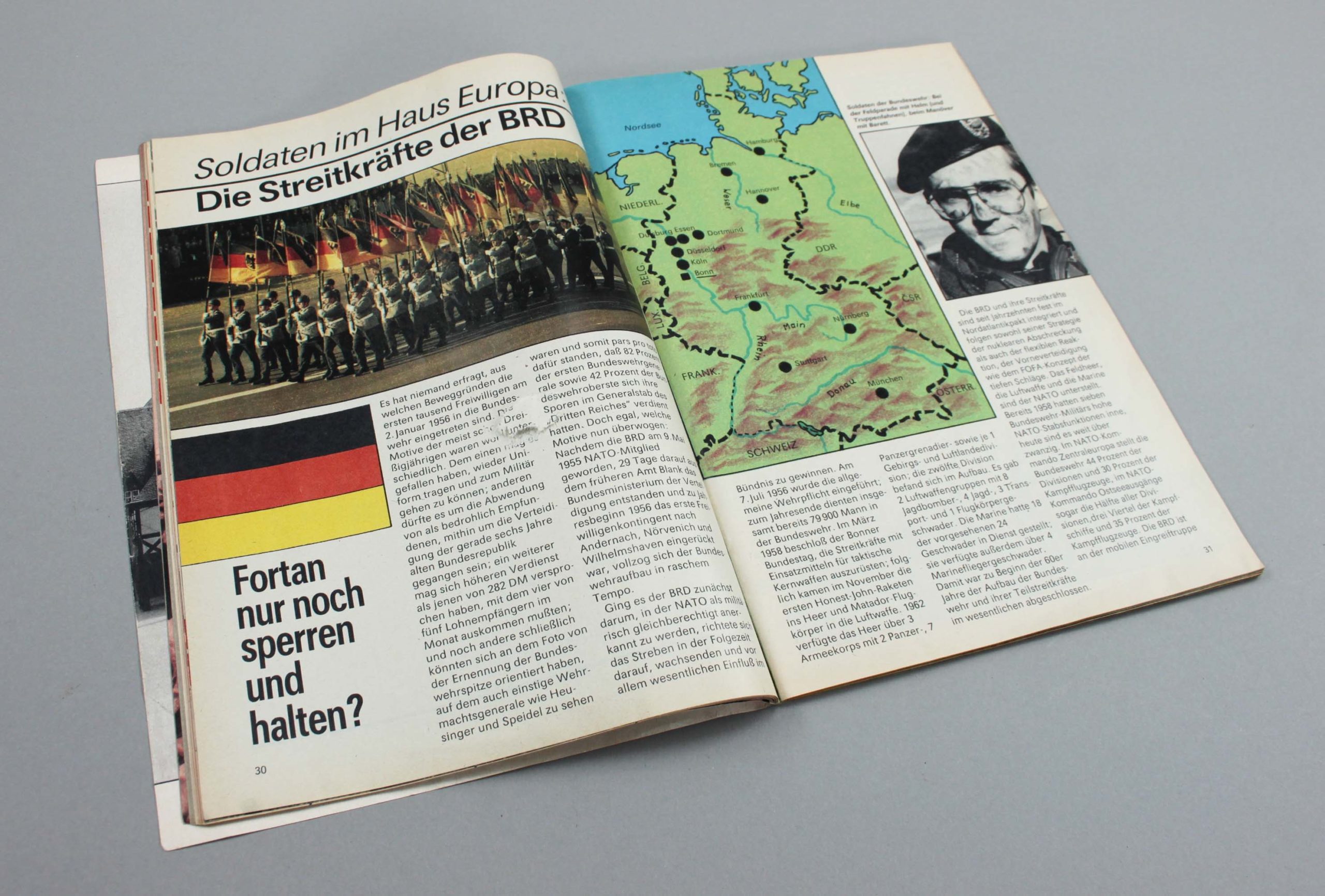 Shortly after the NVA was founded in 1956, the GDR’s military publishing house began publishing magazines and newspapers for various target groups, such as the weekly newspaper “Volksarmee”, the magazine “Militärwesen” for officers and the magazine “Militärgeschichte”. The magazine “Armeerundschau” with the subtitle “Zeitschrift für Militärwesen, Politik und Kultur in der Nationalen Volksarmee” and later “Magazin des Soldaten” was also aimed at the civilian population. Only around five percent of the magazines sold went to the NVA and border troops.