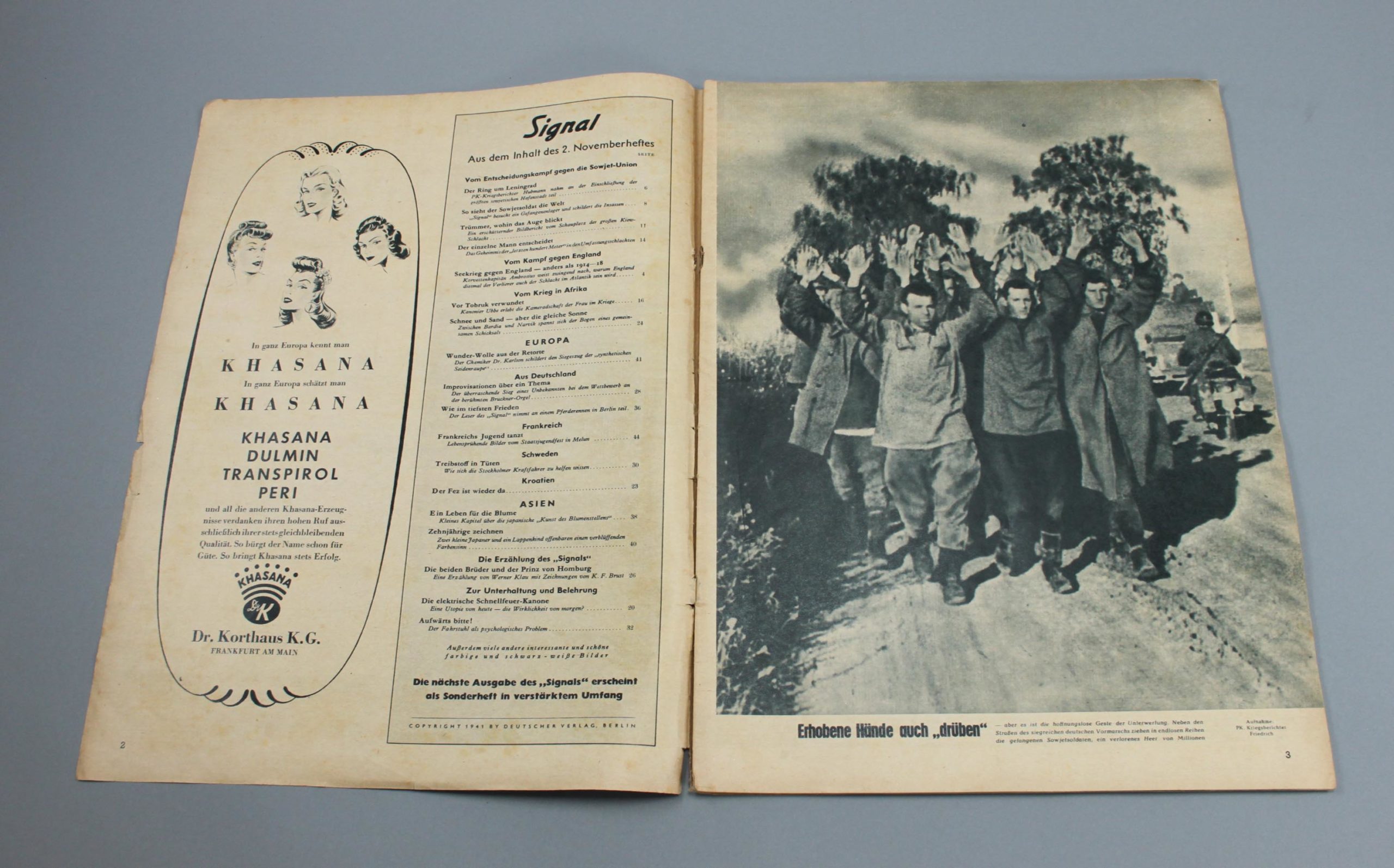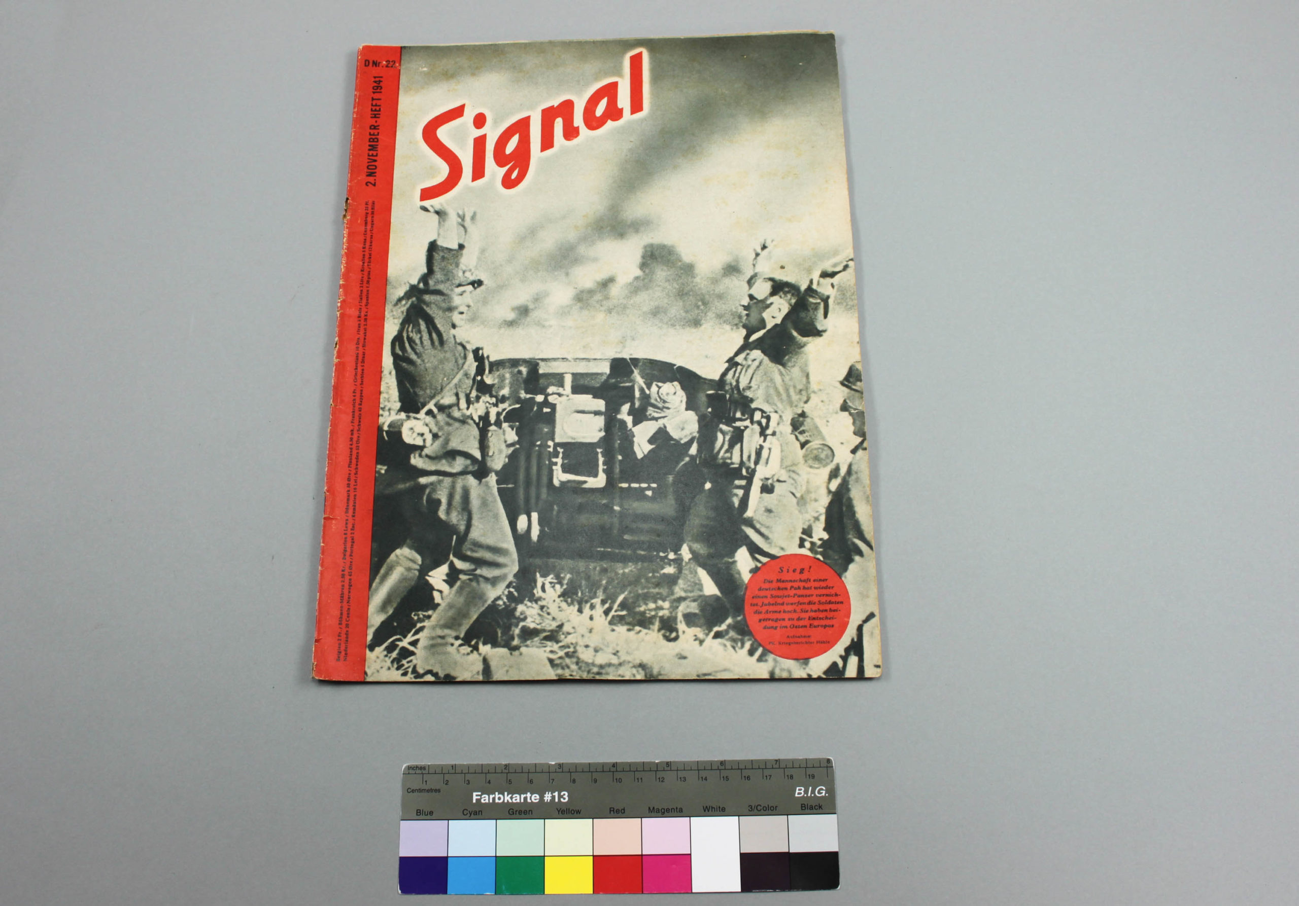The foreign magazine “Signal” was a richly illustrated and well-received product of Nazi propaganda. Deutsche Verlag published it from April 1940 to March 1945 as a special edition of the “Berliner Illustrirte Zeitung” in cooperation with the Office for Wehrmacht Propaganda in the High Command of the Wehrmacht and, at the beginning, the Foreign Office. Renowned Nazi journalists and photographers worked for the magazine; the printing and layout were in keeping with the times and were based on the American magazine “Life”.