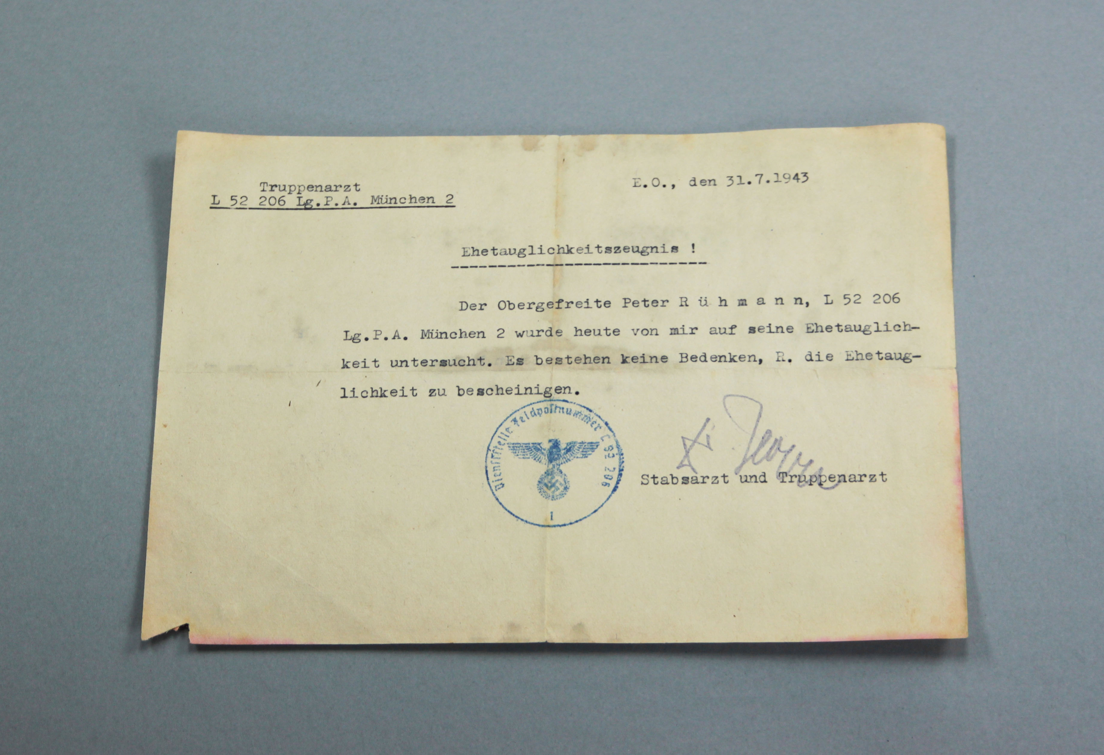 Im Falle des Obergefreiten Rühmann übernahm die Bescheinigung zur Ehetauglichkeit 1943 der Truppenarzt. Er hatte Glück. Wie viele andere Soldaten wollte Rühmann seine Partnerin möglichst schnell und nicht erst bei Kriegsende heiraten. So war die Frau im Falle des Todes ihres Mannes im Krieg finanziell abgesichert. Eine Eheschließung förderte jedoch auch das Vertrauen, dass die Ehepartner in der langen Abwesenheit des Mannes von der Heimat treu blieben.