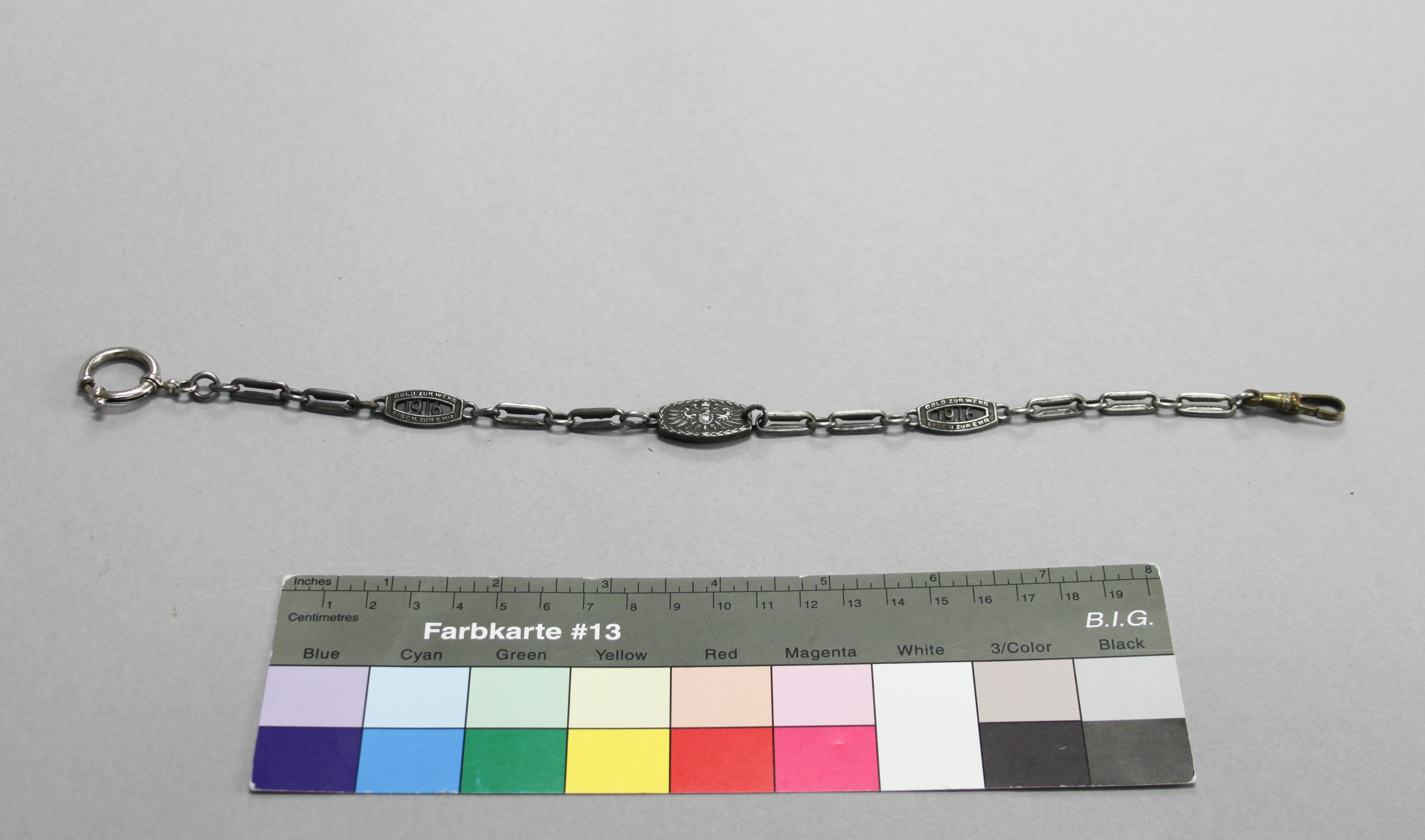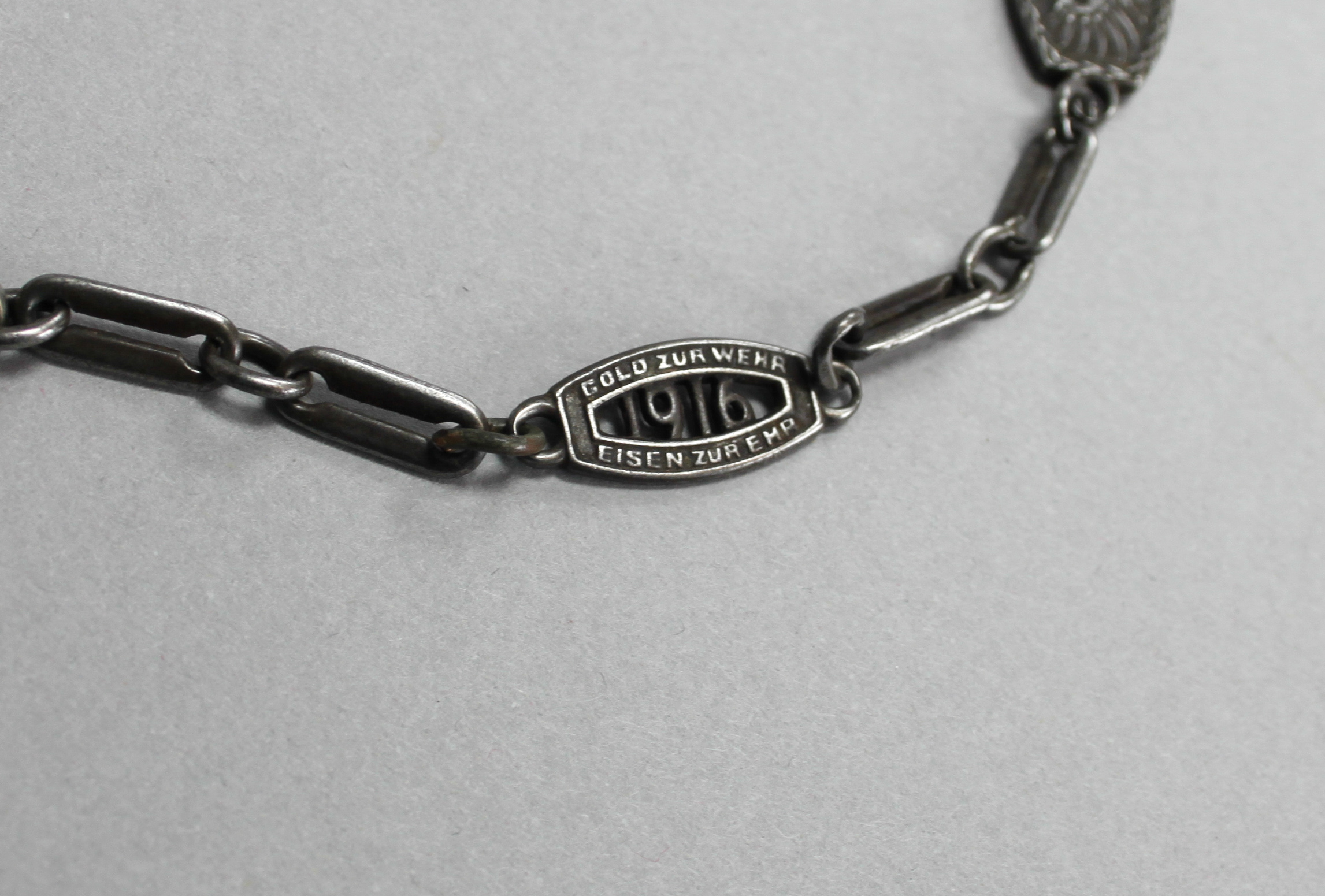 Die eiserne Uhrenkette wurde von der bekannten Schmuckindustrie in Pforzheim seriell und in vielen Varianten hergestellt. Ihre Inschrift „Gold zur Wehr. Eisen zur Ehr. 1916“ und „In Eiserner Zeit 1916“ verweist auf den Anlass ihrer Herstellung: Den Ersten Weltkrieg und dem damit verbundenen Bedarf an Geld und Rohstoffen. Menschen, die einen gewissen Geldbetrag oder Edelmetalle an den Staat spendeten, erhielten dafür Urkunden oder Schmuck aus Eisen.