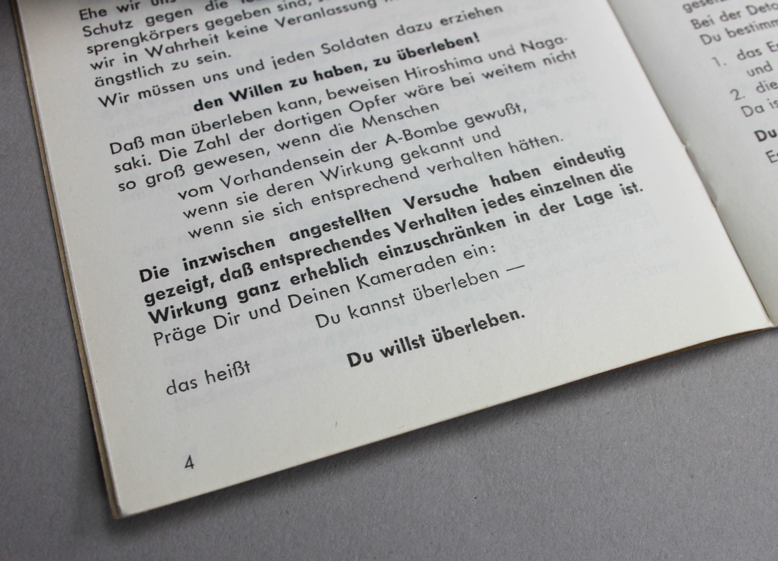„Wir müssen uns und jeden Soldaten dazu erziehen den Willen zu haben, zu überleben! Daß man überleben kann, beweisen Hiroshima und Nagasaki. Die Zahl der dortigen Opfer wäre bei weitem nicht so groß gewesen, wenn die Menschen vom Vorhandensein der A-Bombe gewußt, wenn sie deren Wirkung gekannt und wenn sie sich entsprechend verhalten hätten.“ Folgerichtig wurden im Heft möglichst einfach die Abläufe einer Detonation von Lichtblitz, Druckwelle mit Sogwirkung und Strahlung für die Soldaten erläutert und Gegenmaßnahmen empfohlen. Das Verstehen der genauen Gefahren und Abläufe sollte zu einer Bewältigung der Gefahr beitragen. So stehe die Vorbereitung der Deckung im Vordergrund: „Der moderne Soldat ist entweder in der Deckung, oder er ist mit dem Bau einer Deckung beschäftigt!“ Doch spätestens bei den geschilderten Zeitabläufen dürften die Zeitgenossen an der Wirksamkeit der Verhaltensempfehlungen gezweifelt haben: „Du hast also immerhin drei Zehntelsekunden Zeit, zu reagieren. Damit hat der gut ausgebildete Soldat eine Chance!“