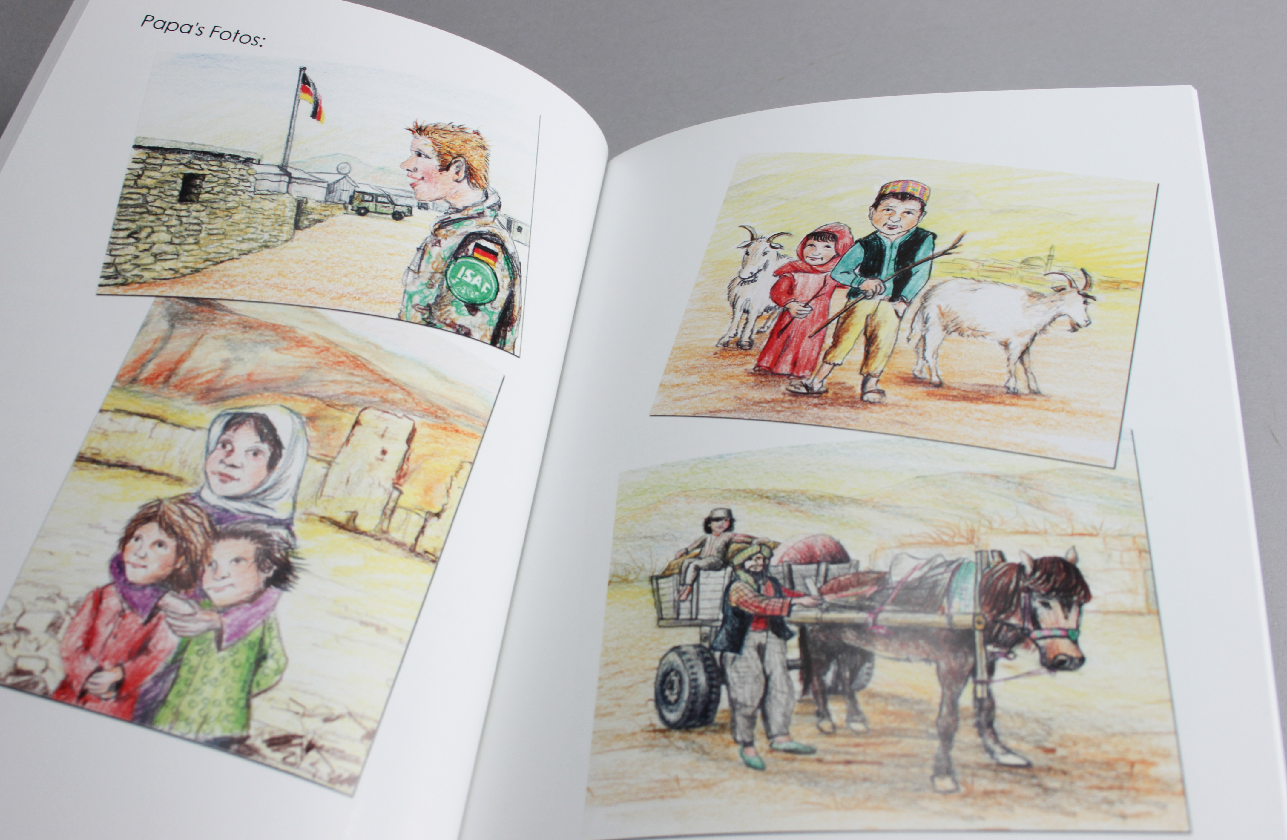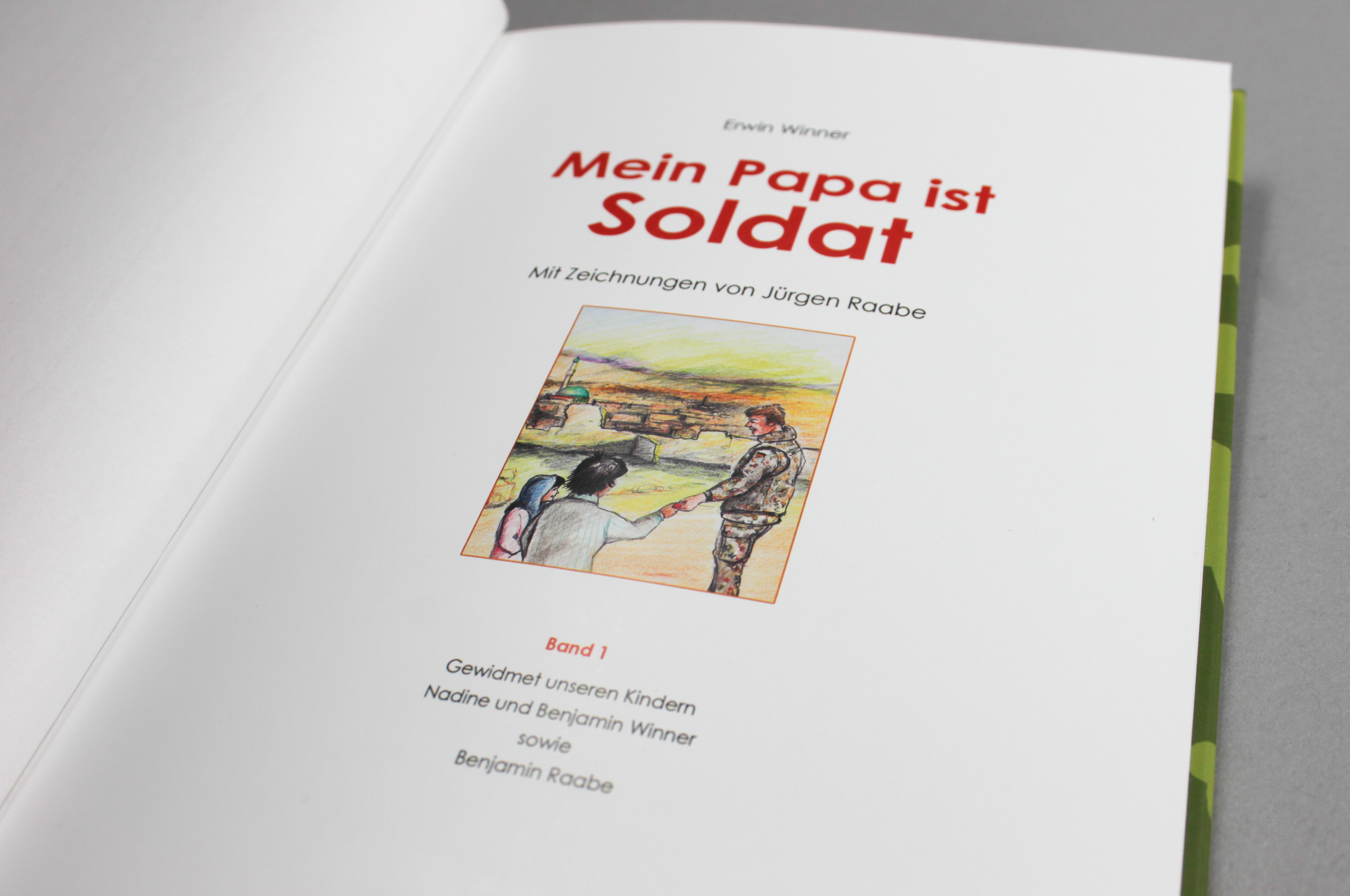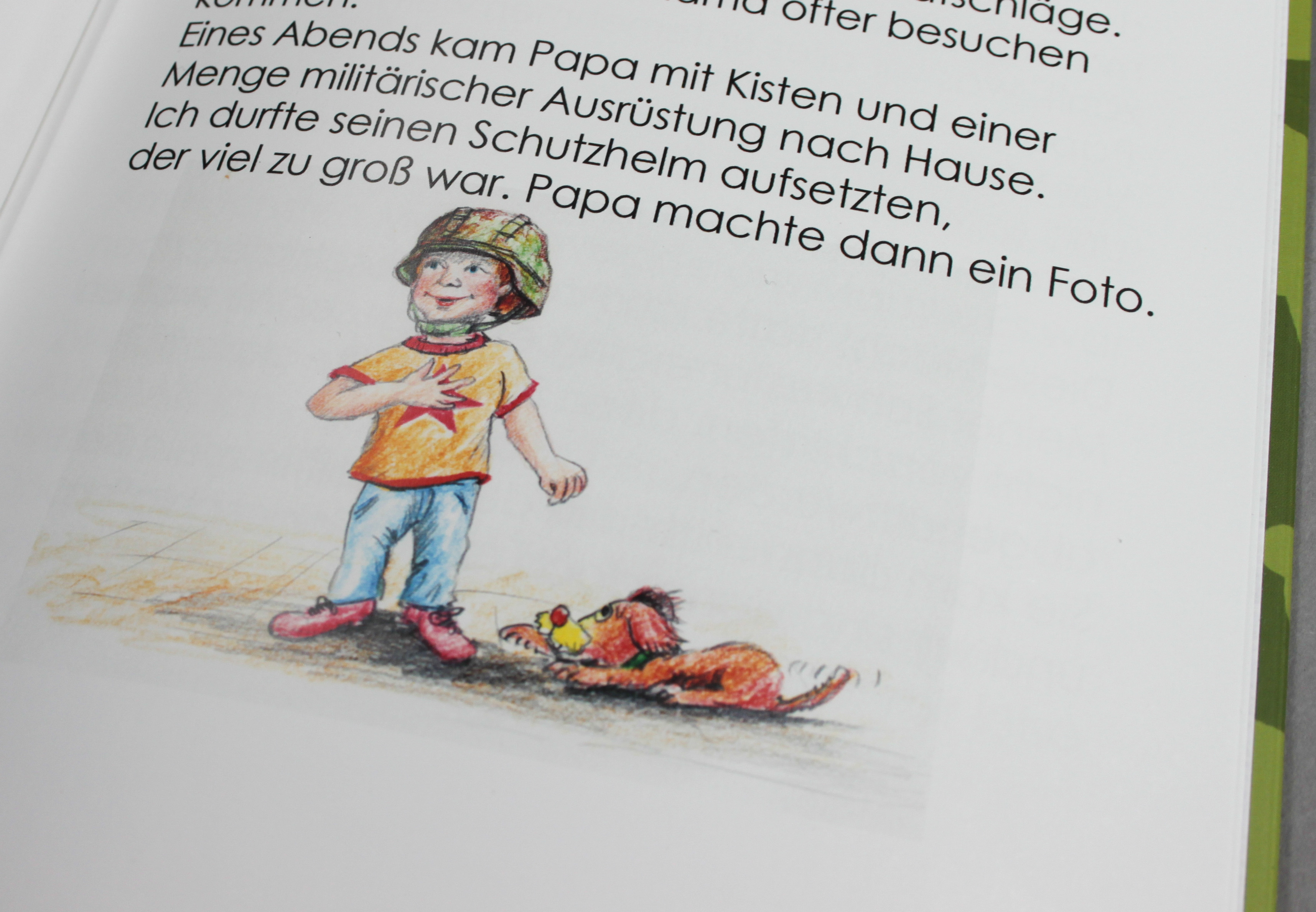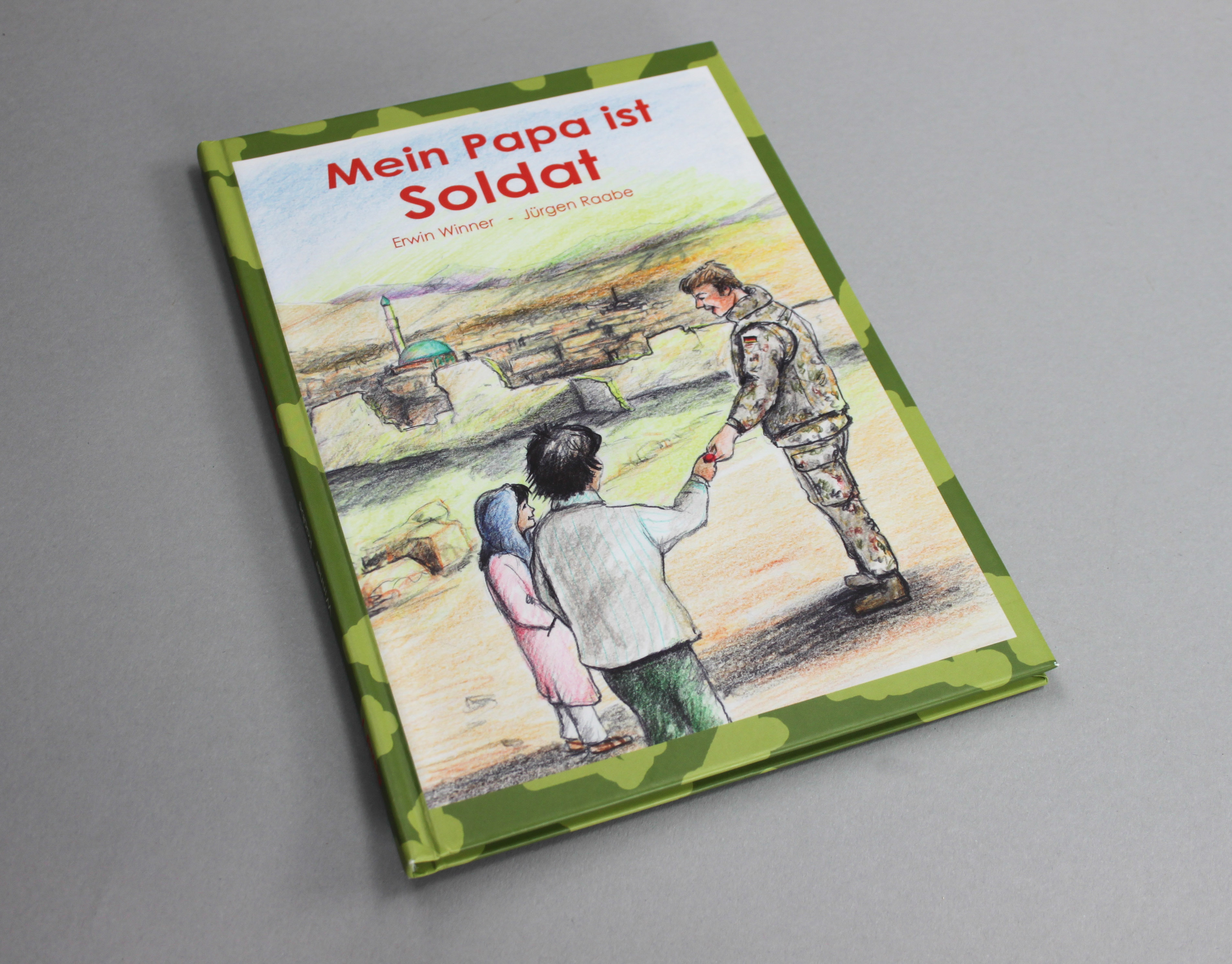 Das Kinderbuch ‚Mein Papa ist Soldat‘ wurde von zwei ehemaligen Bundeswehrsoldaten verfasst, welche selbst im Auslandseinsatz waren. Sie kennen daher die Belastungen, die ein solcher Einsatz für die Familie mit sich bringt. Im Buch versuchen sie für Kinder verständlich zu erklären, was der Vater im Einsatz macht. Papa Sven ist Bautechniker und hilft, in Afghanistan Krankenhäuser und Schulen zu bauen. Die Besonderheiten des Soldatenberufes werden jedoch nicht deutlich, Sven könnte ebenso bei einer Entwicklungshilfeorganisation arbeiten. Der Soldatenberuf wird auf den humanitären Teil des Einsatzes reduziert: „Soldaten aus der ganzen Welt helfen den Menschen im Kosovo, um wieder friedlich miteinander leben zu können.“ oder „Die Familien dort sind […] viel ärmer und können ohne unsere Unterstützung kein normales Leben mehr führen.“