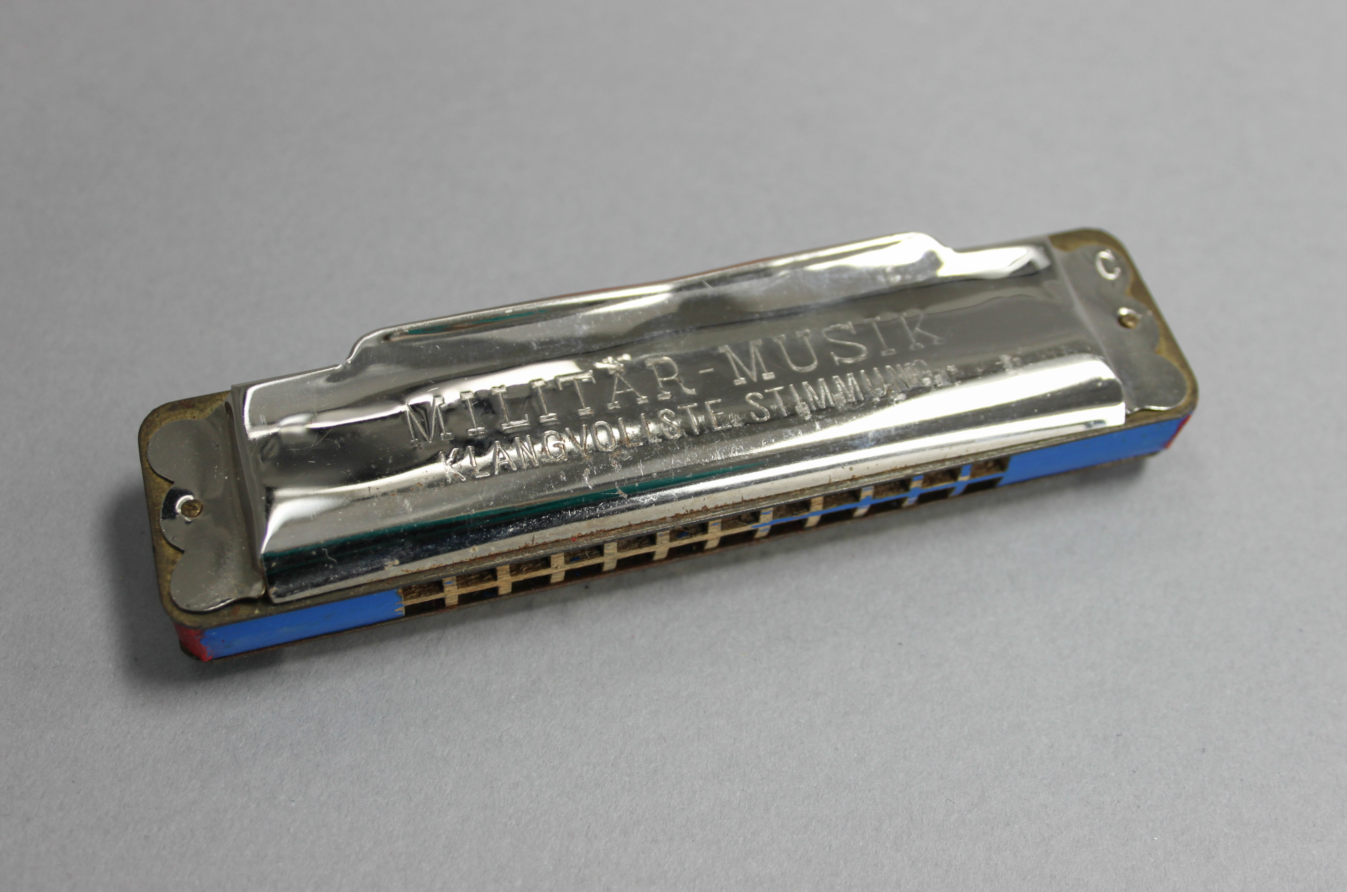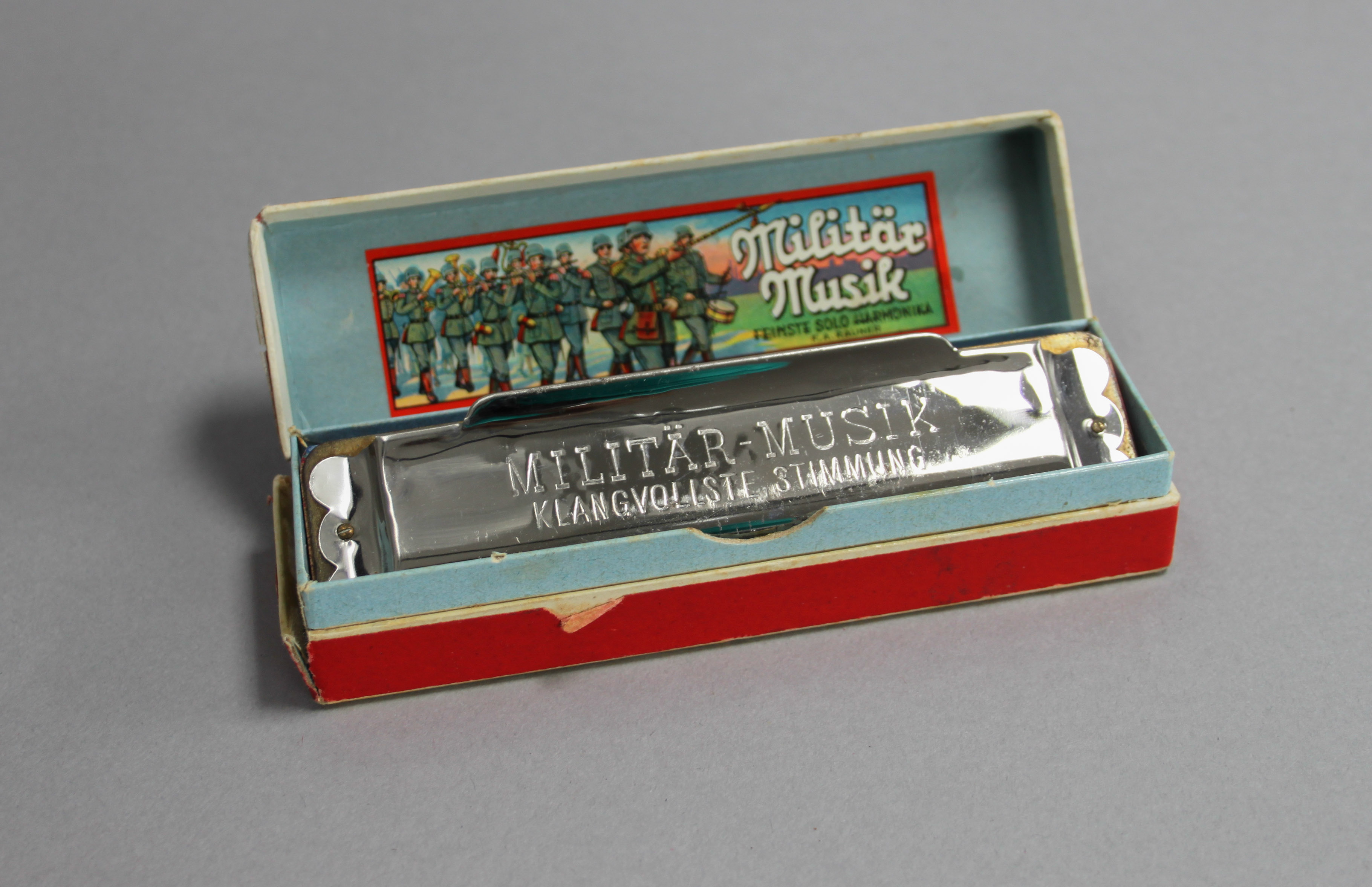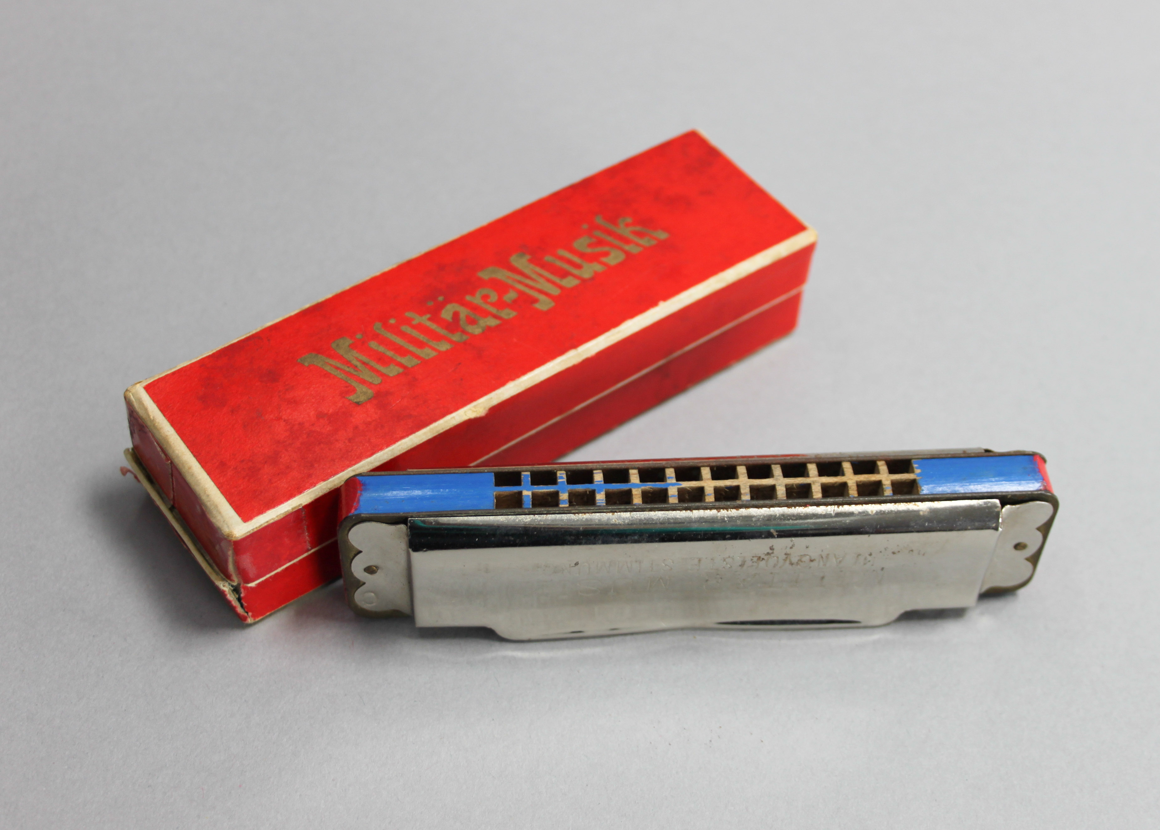 Diese Mundharmonika der sächsischen Firma F.A. Rauner wurde zwischen 1935 und 1943 hergestellt und in einer verzierten Schachtel geliefert. Sie ziert die Abbildung eines marschierenden Musikkorps der Wehrmacht. Für Marschmusik war die Mundharmonika jedoch weniger geeignet. Sie war eher ein Soloinstrument. Die Mundharmonika war besonders bei Mannschaftssoldaten beliebt und galt als „Sorgenbrecher“. Ihr Spiel sollte eine Ablenkung vom Kriegsalltag bieten, Trost spenden und den Soldaten eine musische Betätigung ermöglichen.