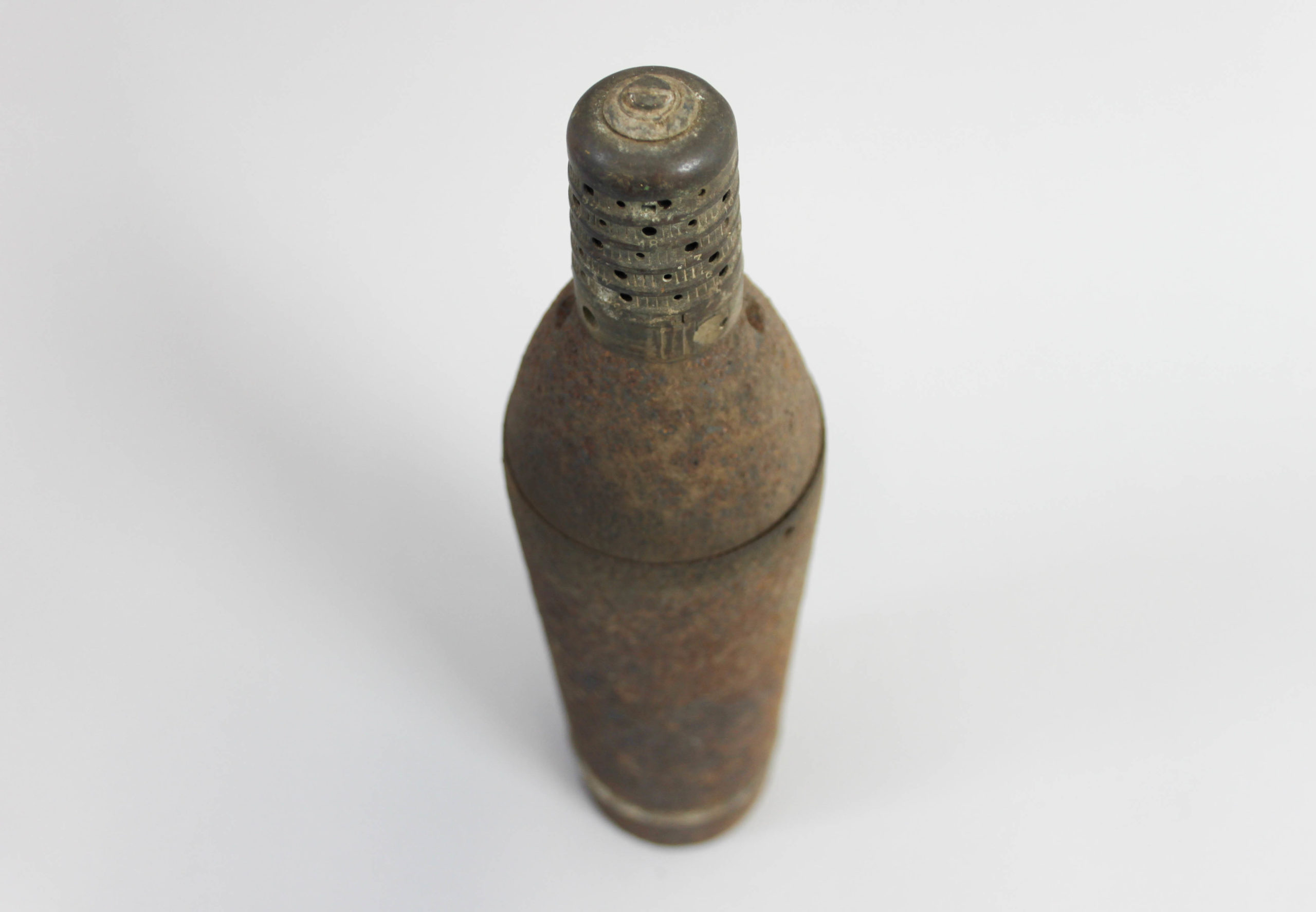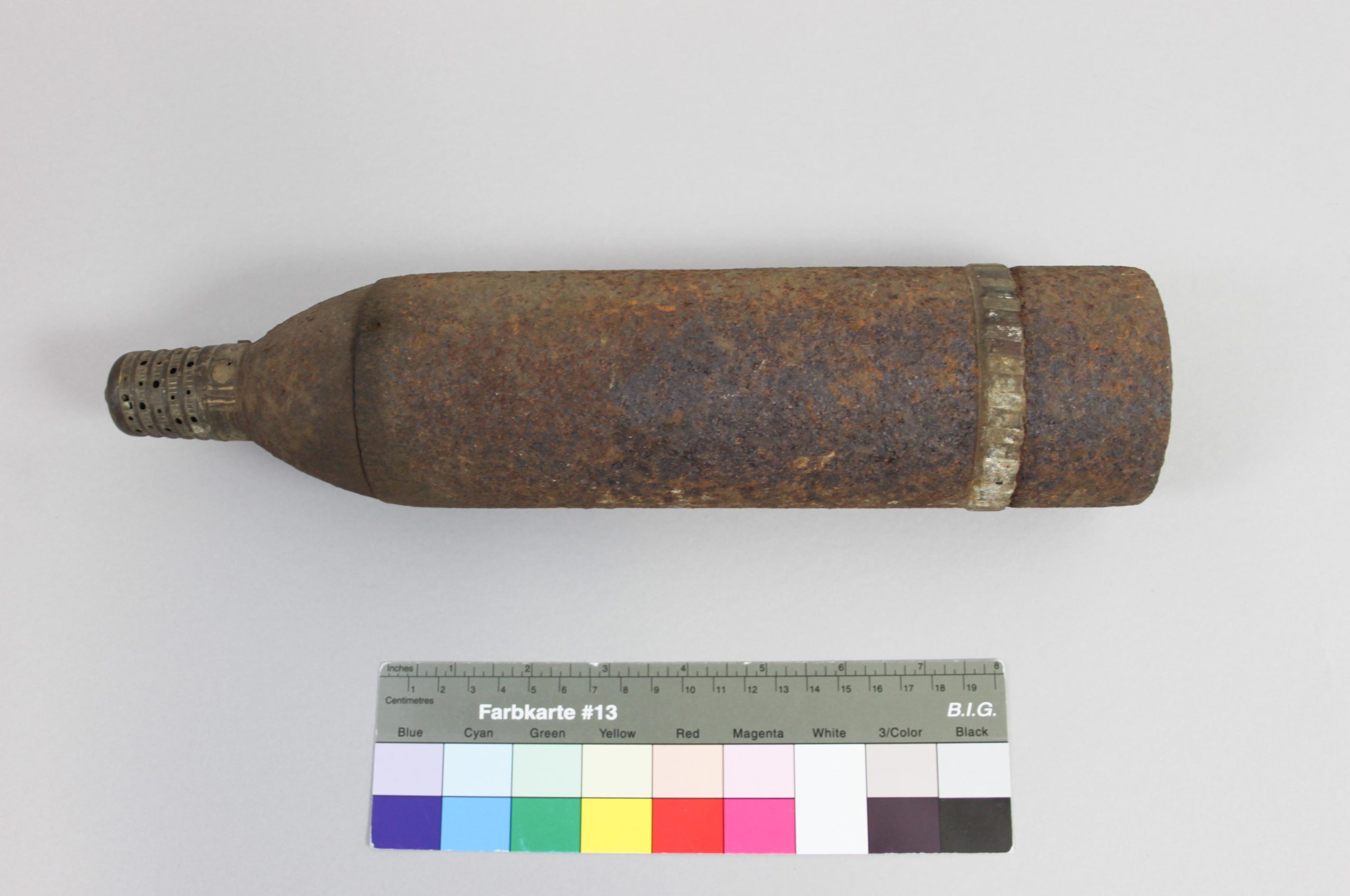 Allein in der Schlacht von Verdun 1916 verschoss die französische Armee schätzungsweise 23 Millionen Granaten unterschiedlicher Art. Noch heute werden täglich Geschosse aller Kriegsparteien im Boden gefunden. Bei einem Fund oder der Vermutung eines Fundes muss unverzüglich die Polizei bzw. der Kampfmittelräumdienst benachrichtigt werden. Die Fundmunition darf auf keinen Fall bewegt oder berührt werden. Der Besitz von Munition oder Munitionsteilen die dem Waffengesetz, dem Kriegswaffenkontrollgesetz und dem Sprengstoffgesetz unterliegen ist strafbar. Bei unserem Objekt des Monats handelt es sich um einen leeren verschossenen Bodenfund, der durch fachkundiges Personal begutachtet und freigegeben wurde.