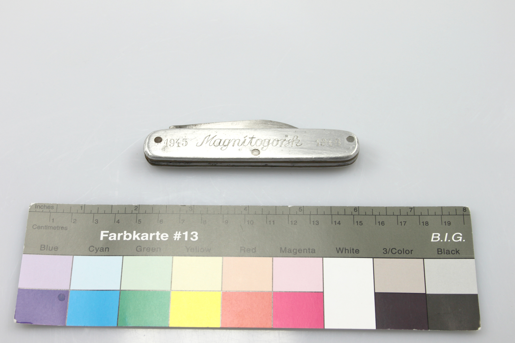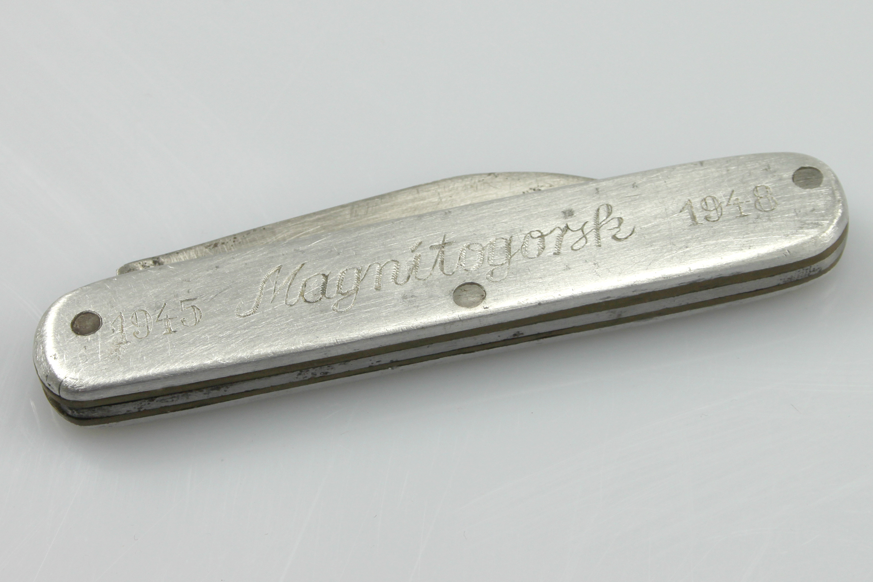 Das Messer sieht auf den ersten Blick unauffällig aus. Die saubere, verschnörkelte Inschrift zeigt den Namen des Besitzers auf der einen Seite: „Waldemar Zinser“. Doch die andere Seite gibt einen Hinweis auf die Geschichte dieses Messers: „1945 Magnitogorsk 1948“. Es verweist auf die Kriegsgefangenschaft von Waldemar Zinser im sowjetischen Kriegsgefangenenlager 7617 bei Magnitogorsk. Waldemar Zinser gehörte der 18. Panzergrenadierdivision an, mit welcher er zum Kriegsende an der Ostfront in Gefangenschaft geriet. Über ein Sammellager in Braunsberg kommt er nach 16 Tagen Zugfahrt in Magnitogorsk an.