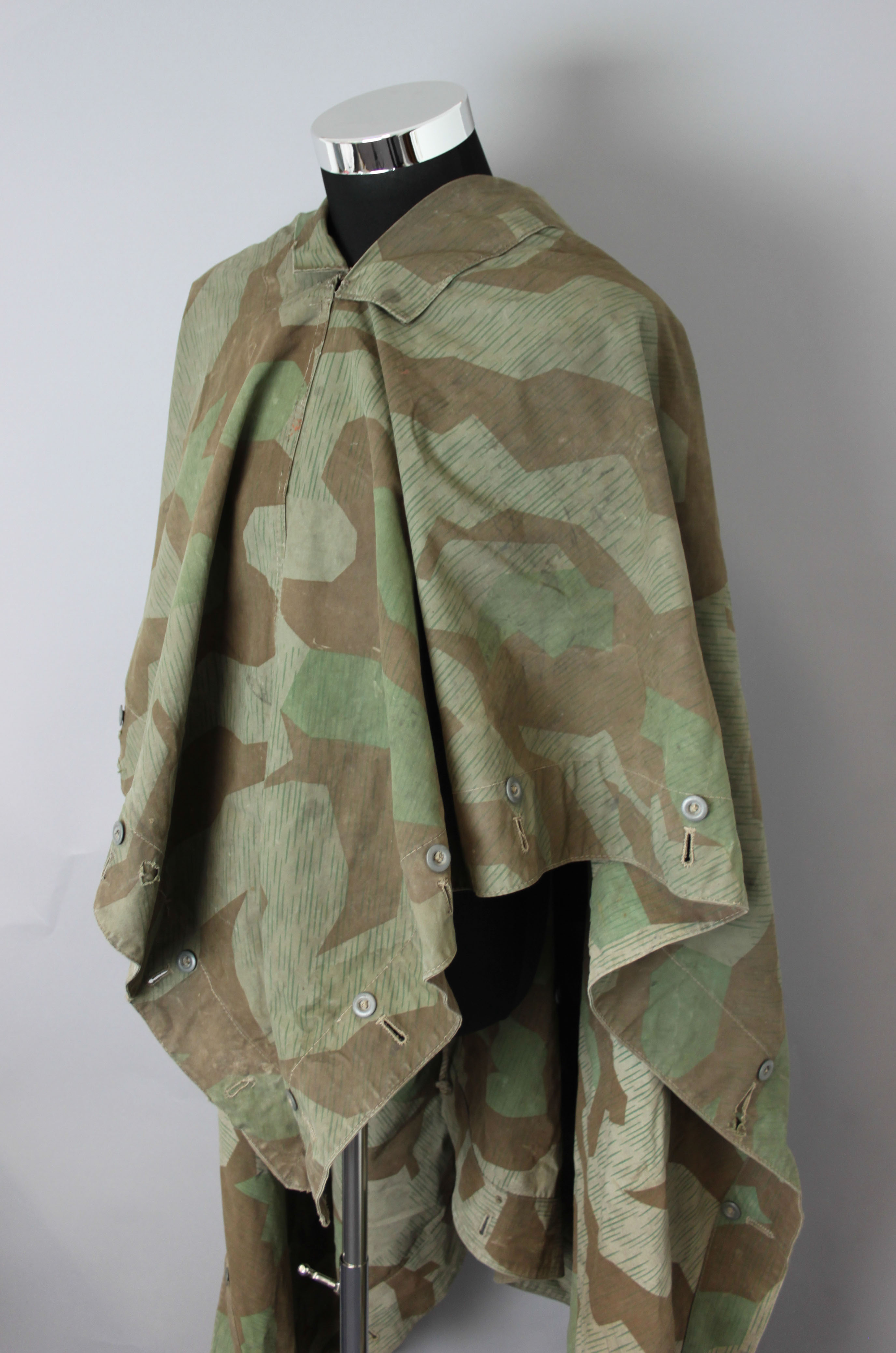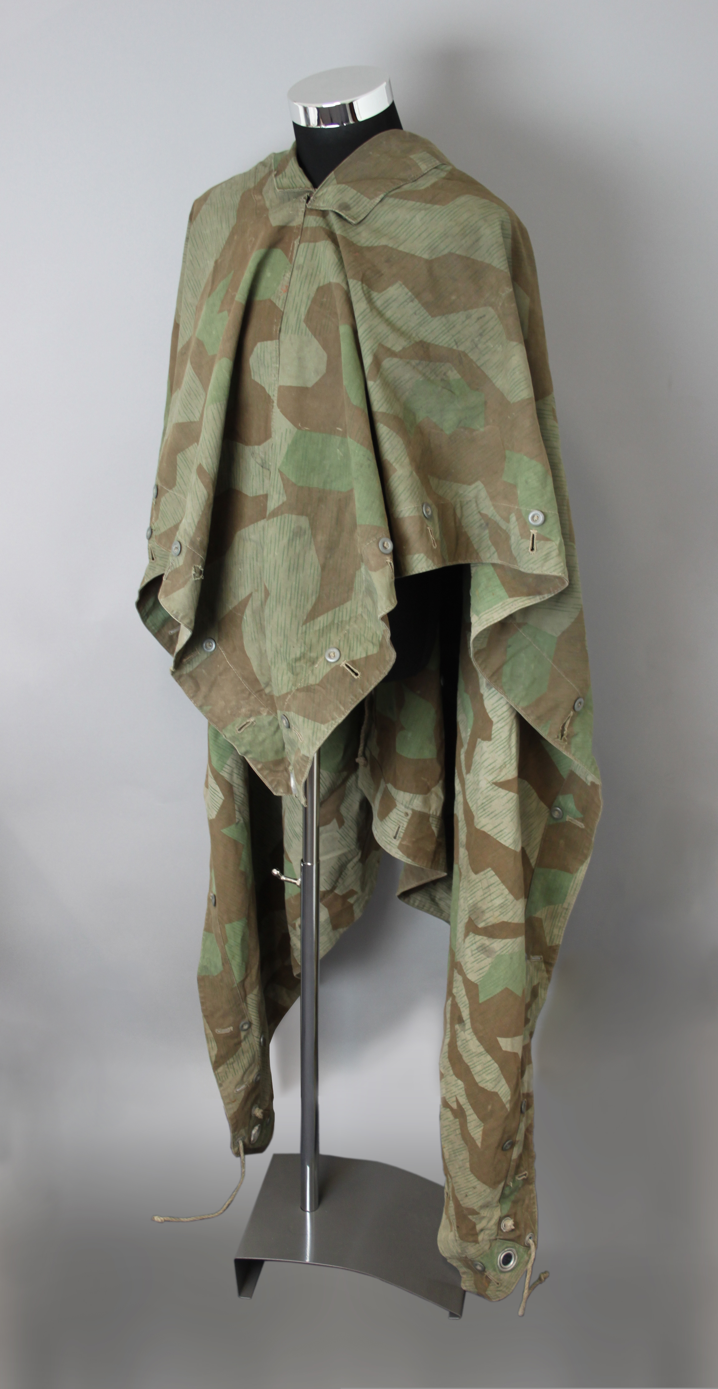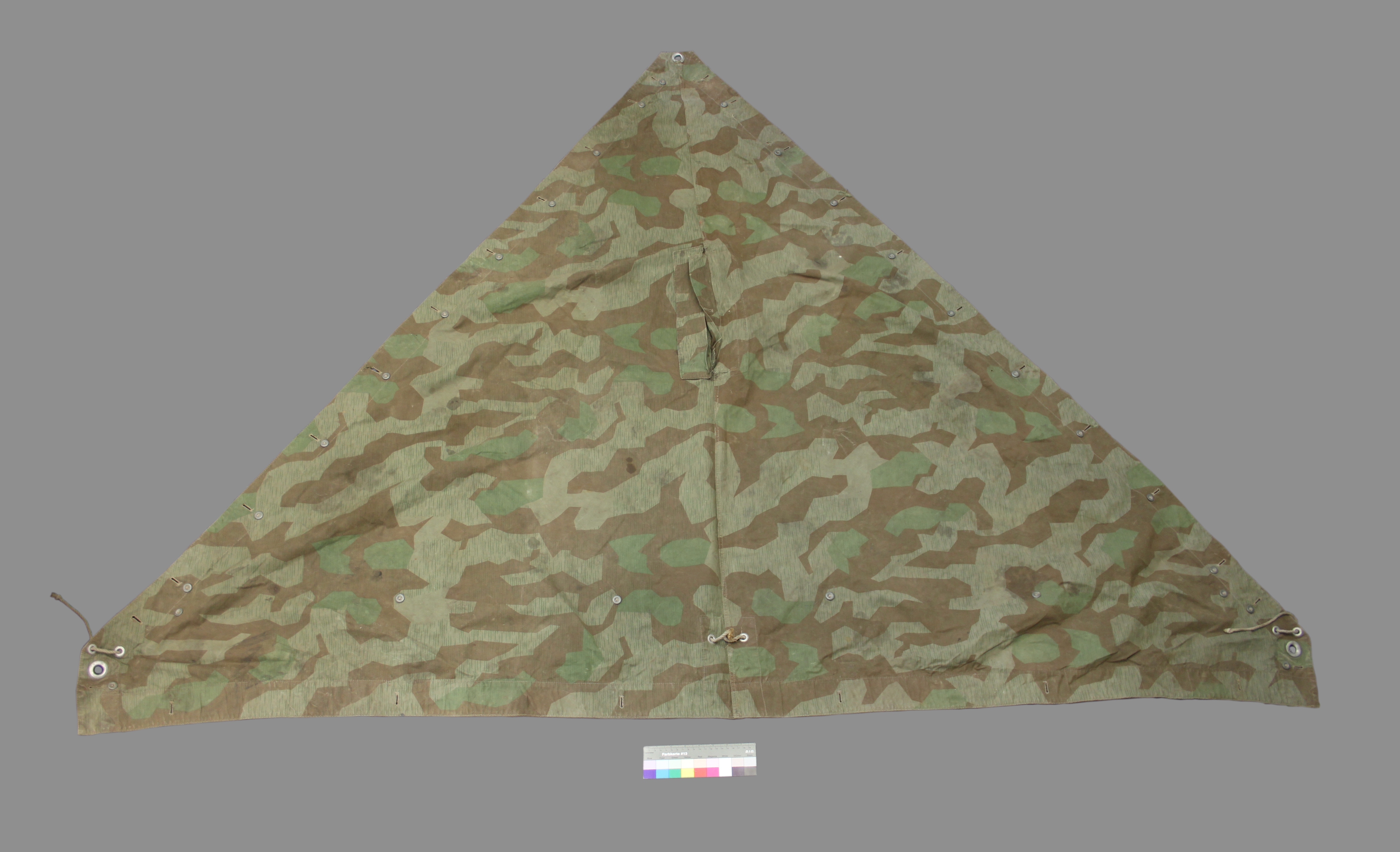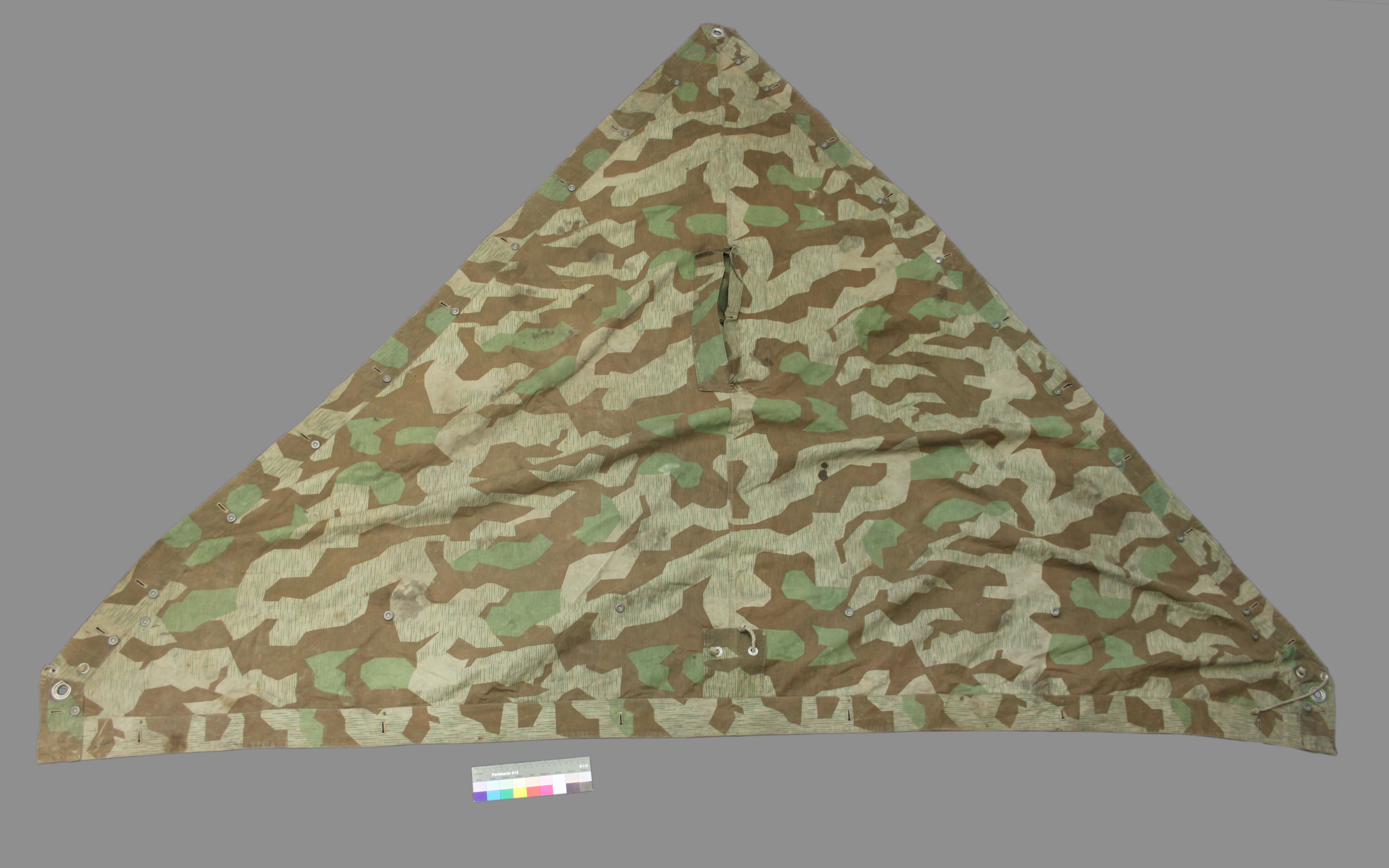 Nicht nur hinsichtlich der Tarnung, sondern auch in der Formgebung der Zeltbahn wurde von dem einfachen grauen Rechteck Abstand genommen. Das dreieckige Stoffstück mit diversen Ösen und Knöpfen war ein Multifunktionstool und konnte für sich genommen als Windschutzzelt, als Trage für Verletzte oder kombiniert mit weiteren Zeltbahnen als Schlafzelt dienen. Eine Öffnung in der Mitte ermöglicht, die Zeltbahn zum Regenschutz als Poncho über der Uniform zu tragen.