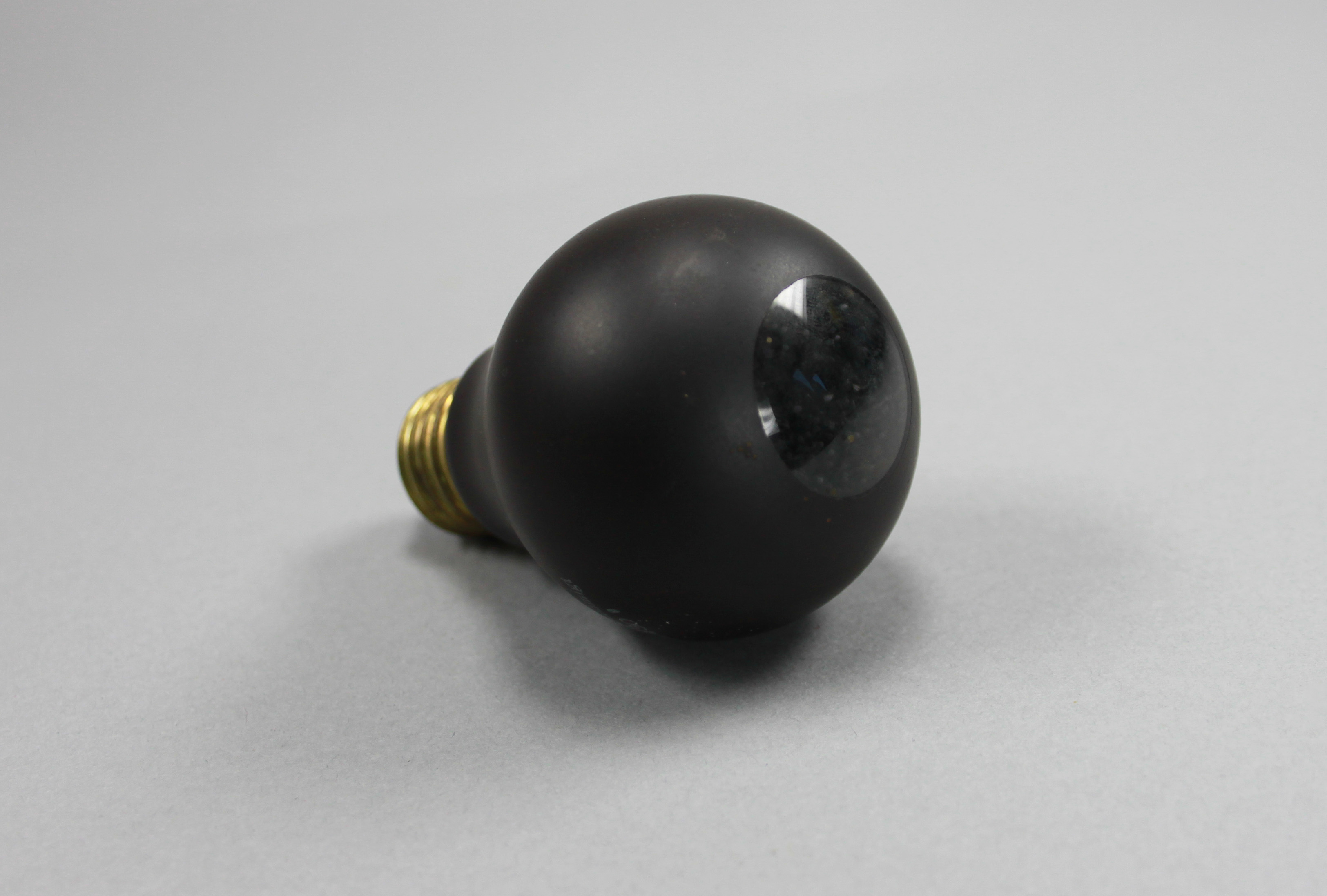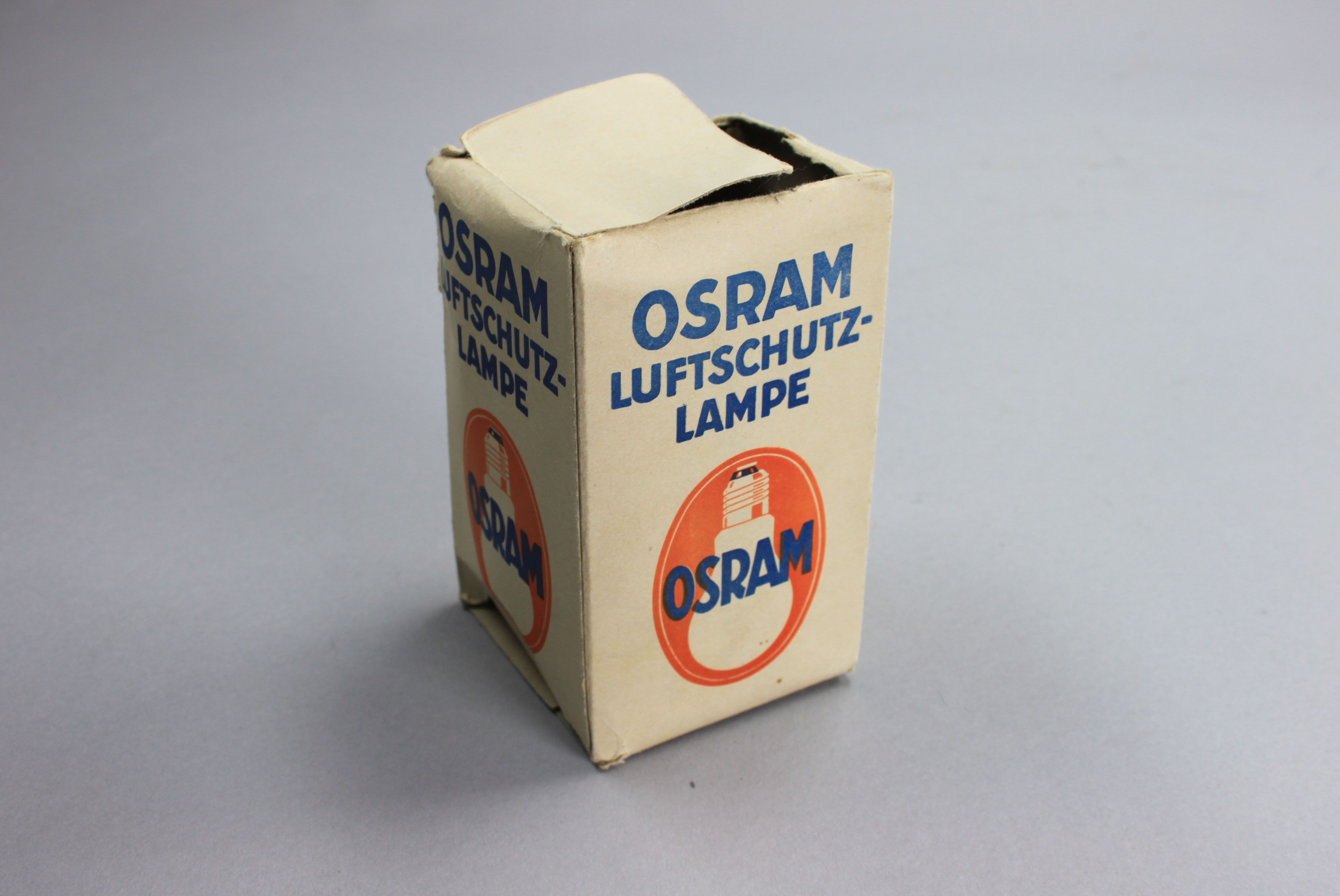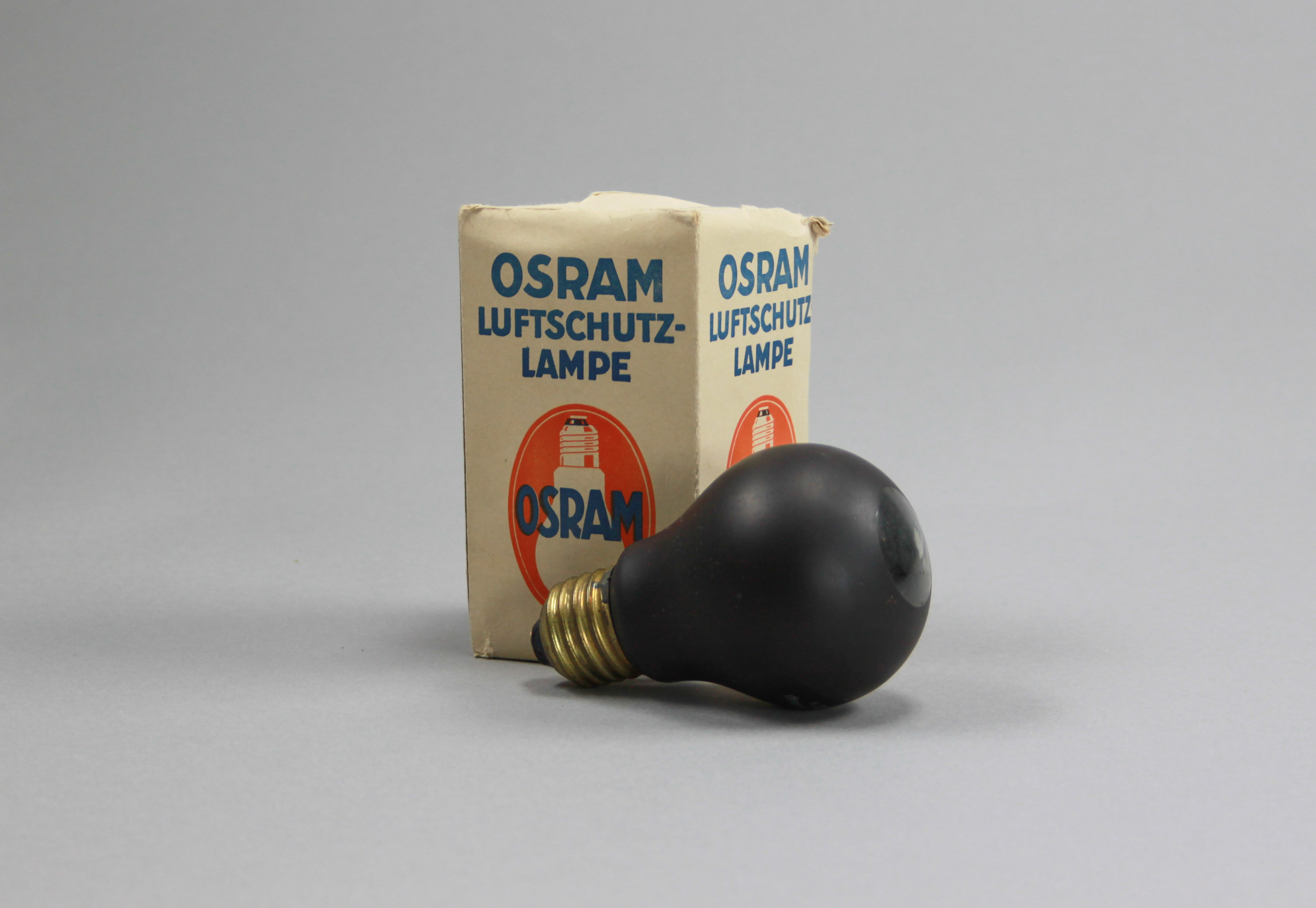 Eine schwarze Glühbirne, nur durch ein kleines Loch dringt ein schmaler Lichtstrahl. Diese Lampe der Firma Osram mutet merkwürdig an und hatte nur einen Zweck: Mit möglichst wenig Licht einen Raum erleuchten; kein Lichtstrahl durfte zu den Seiten hinausdringen.
